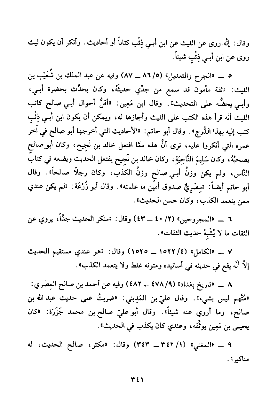 ٥ - "الجرح والتعديل" (٥/ ٨٦ - ٨٧) وفيه عن عبد الملك بن شُعَيْب بن الليث: "ثقة مأمون قد سمع من جدِّي حديثَهُ، وكان يحدِّث بحضرة أبي، وأبي يحضُّه على التحديث". وقال ابن مَعِين: "أقلُّ أحوال أبي صالح كاتب الليث أنه قرأ هذه الكتب على الليث وأجازها له، ويمكن أن يكون ابن أبي ذِئْبٍ كتب إليه بهذا الدُّرج". وقال أبو حاتم: "الأحاديث التي أخرجها أبو صالح في آخر عمره التي أنكروا عليه، نرى أنَّ هذه ممَّا افتعل خالد بن نَجِيح، وكان أبو صالحٍ يصحبُهُ، وكان سَلِيمَ النَّاحِيَةِ، وكان خالد بن نَجِيح يفتعل الحديث ويضعه في كتاب النَّاس، ولم يكن وزنُ أبي صالحٍ وزنُ الكذب، وكان رجلًا صالحًا". وقال أبو حاتم أيضًا: "مِصْرِيٌّ صدوق أمين ما علمته". وقال أبو زُرْعَة: "لم يكن عندي ممن يتعمد الكذب، وكان حسن الحديث".