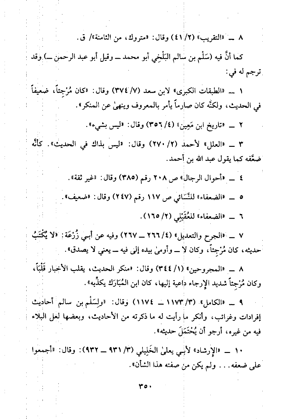 ٩ - "الكامل" (٣/ ١١٧٣ - ١١٧٤) وقال: "ولِسَلْم بن سالم أحاديث إفرادات وغرائب، وأنكر ما رأيت له ما ذكرته من الأحاديث، وبعضها لعل البلاء فيه من غيره، أرجو أن يُحْتَمَلَ حديثه".