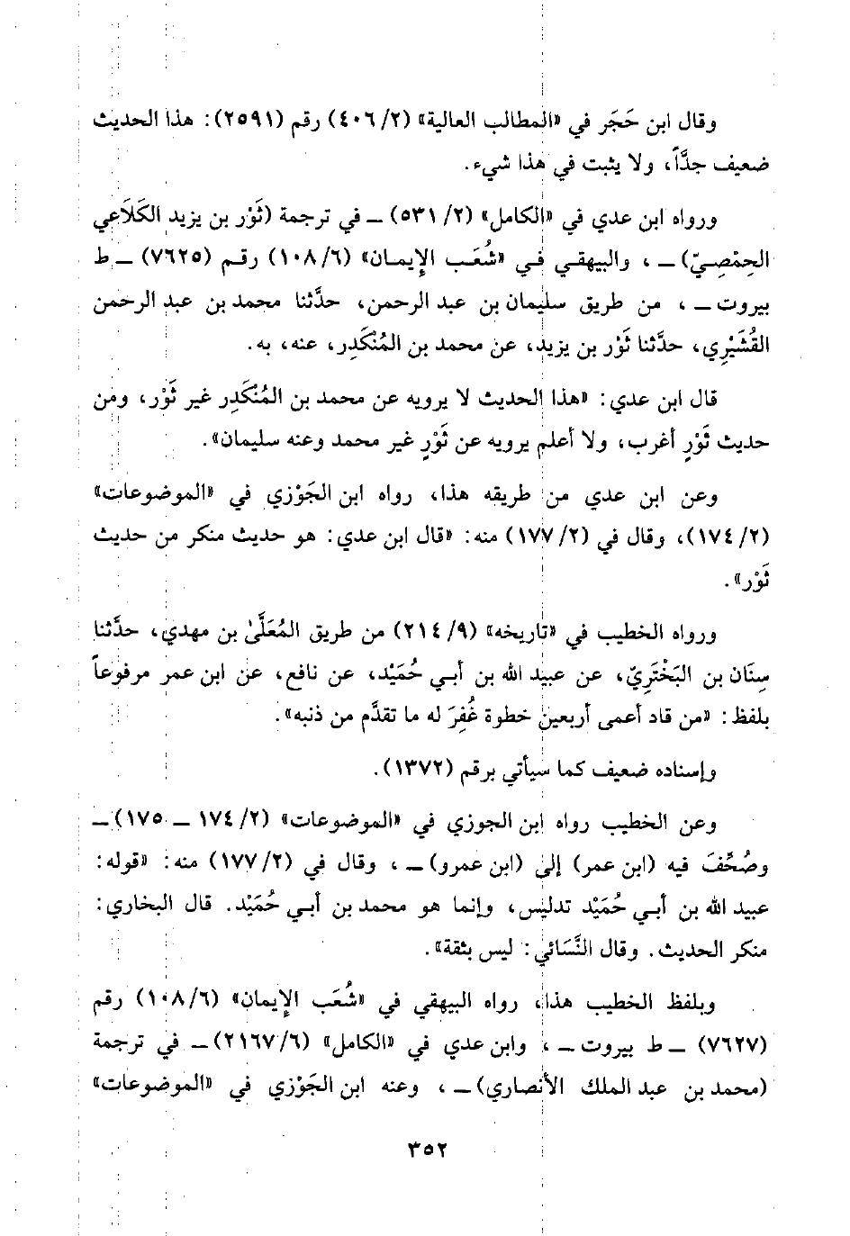 وعن الخطيب رواه ابن الجوزي في "الموضوعات" (٢/ ١٧٤ - ١٧٥) -وصُحِّفَ فيه (ابن عمر) إلى (ابن عمرو) -، وقال في (٢/ ١٧٧) منه: "قوله: عبيد اللَّه بن أبي حُمَيْد تدليس، وإنما هو محمد بن أبي حُمَيْد. قال البخاري: منكر الحديث. وقال النَّسَائي: ليس بثقة".