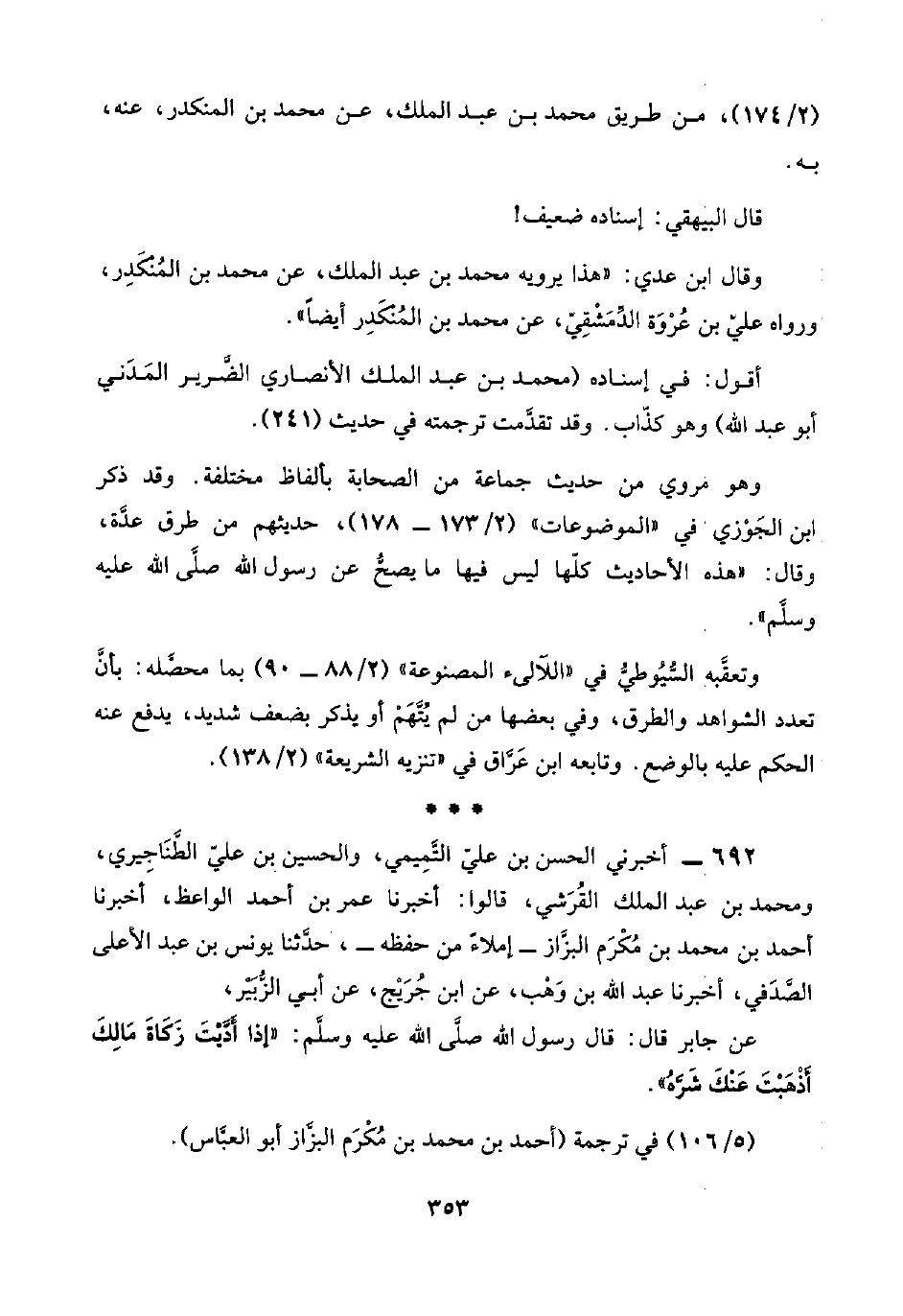 وقال ابن عدي: "هذا يرويه محمد بن عبد الملك، عن محمد بن المُنْكَدِر، ورواه عليّ بن عُرْوَة الدِّمَشْقِيّ، عن محمد بن المُنْكَدِر أيضًا".