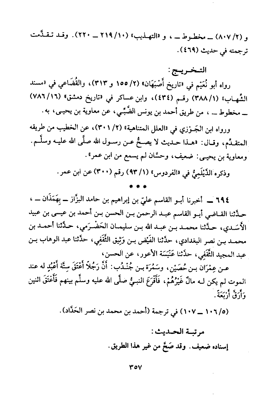 ورواه ابن الجَوْزي في "العلل المتناهية" (٢/ ٣٠١)، عن الخطيب من طريقه المتقدِّم، وقال: "هذا حديث لا يصحُّ عن رسول اللَّه صلَّى اللَّه عليه وسلَّم. ومعاوية بن يحيى: ضعيف، وحسَّان لم يسمع من ابن عمر".