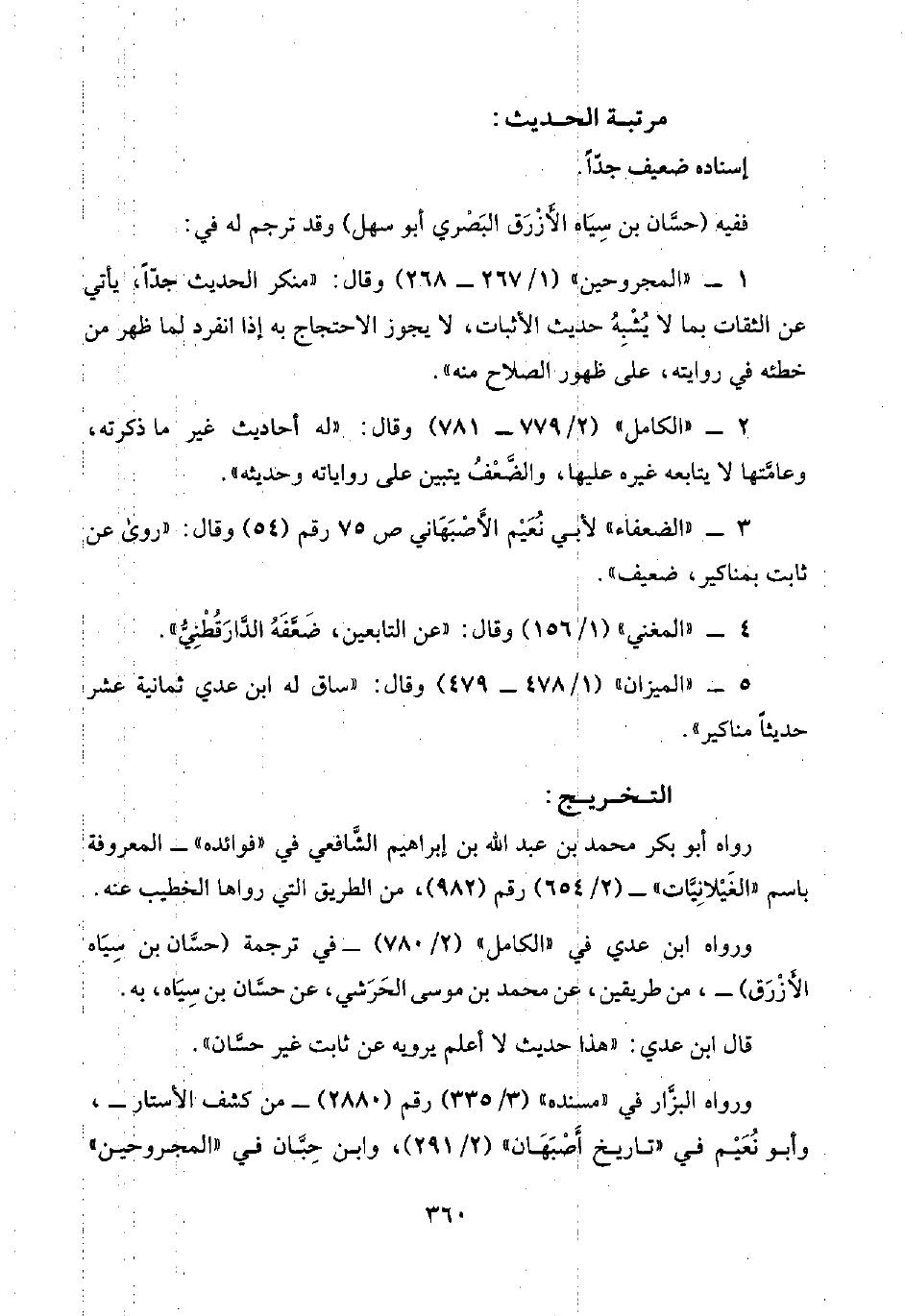 ٢ - "الكامل" (٢/ ٧٧٩ - ٧٨١) وقال: "له أحاديث غير ما ذكرته، وعامتها لا يتابعه غيره عليها، والضَّعْفُ يتبين على رواياته وحديثه".