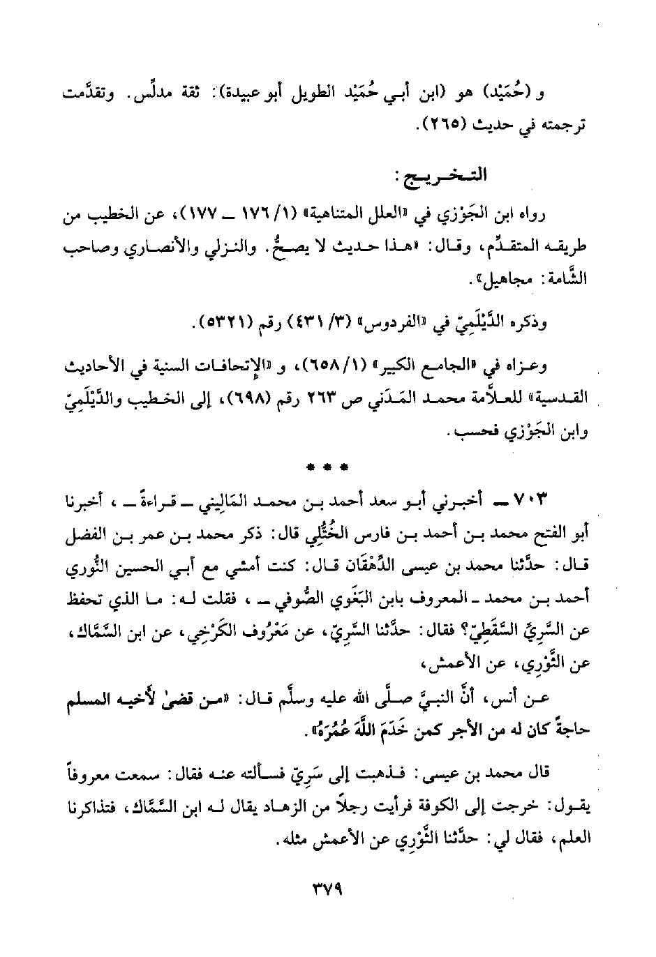 ٧٠٣ - أخبرني أبو سعد أحمد بن محمد المَالِيني -قراءةً-، أخبرنا أبو الفتح محمد بن أحمد بن فارس الخُتُّلِي قال: ذكر محمد بن عمر بن الفضل قال: حدَّثنا محمد بن عيسى الدِّهْقَان قال: كنت أمشي مع أبي الحسين النُّوري أحمد بن محمد -المعروف بابن البَغَوي الصُّوفي-، فقلت له: ما الذي تحفظ عن السَّرِيِّ السَّقَطِيّ؟ فقال: حدَّثنا السَّرِيّ، عن مَعْرُوف الكَرْخِي، عن ابن السَّمَّاك، عن الثَّوْرِي، عن الأعمش،