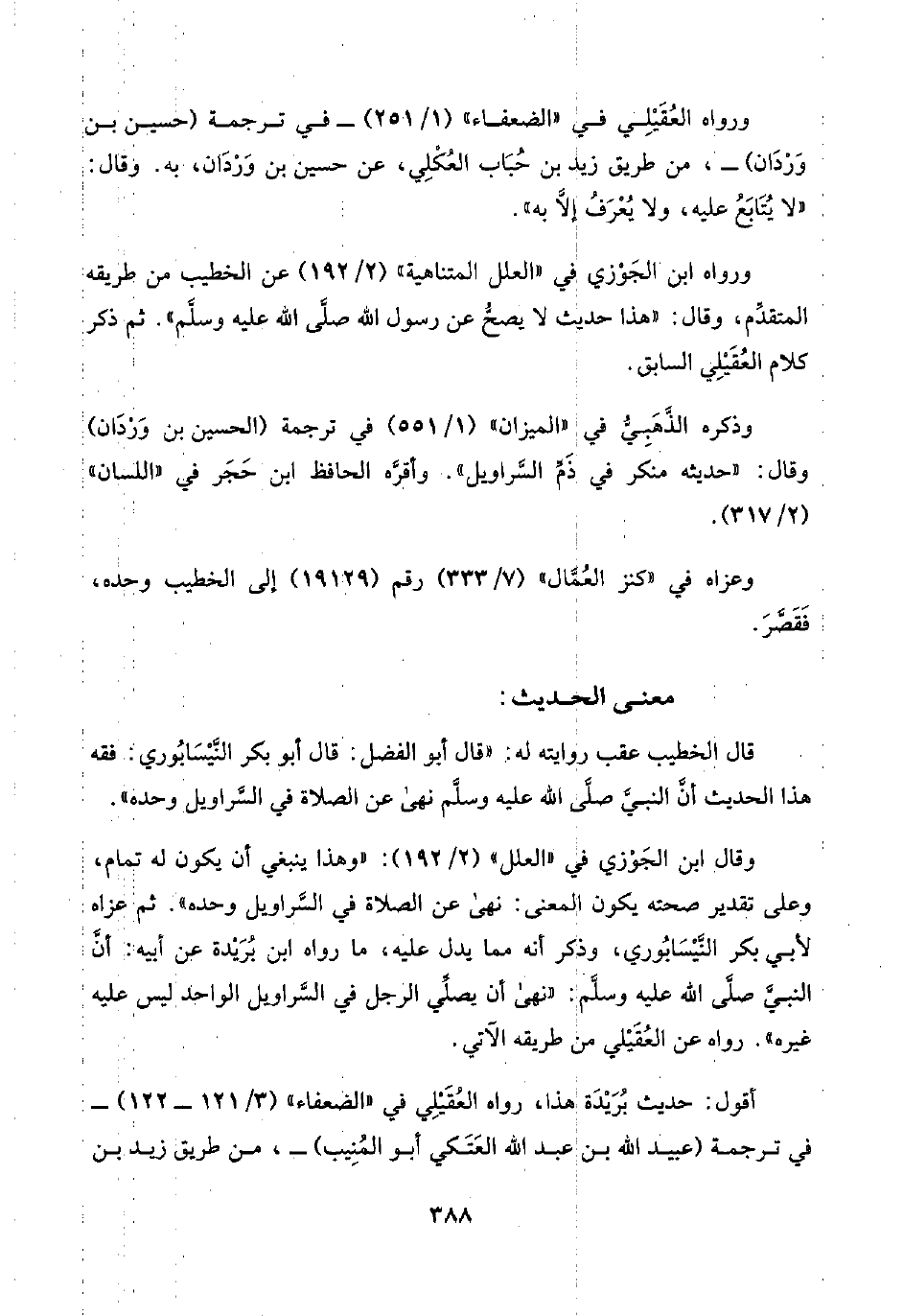 وقال ابن الجَوْزي في "العلل" (٢/ ١٩٢): "وهذا ينبغي أن يكون له تمام، وعلى تقدير صحته يكون المعني: نهى عن الصلاة في السَّراويل وحده". ثم عزاه لأبي بكر النَّيْسَابُوري، وذكر أنه مما يدل عليه، ما رواه ابن بُرَيْدة عن أبيه: أنَّ النبيَّ صلَّى اللَّه عليه وسلَّم: "نهى أن يصلِّي الرجل في السَّراويل الواحد ليس عليه غيره". رواه عن العُقَيْلِي من طريقه الآتي.