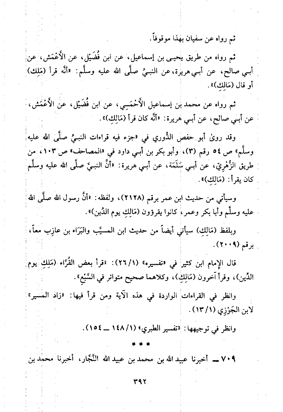 ثم رواه عن محمد بن إسماعيل الأَحْمَسِي، عن ابن فُضَيْل، عن الأَعْمَش، عن أبي صالح، عن أبي هريرة: "أنَّه كان قرأ (مَالِكِ) ".