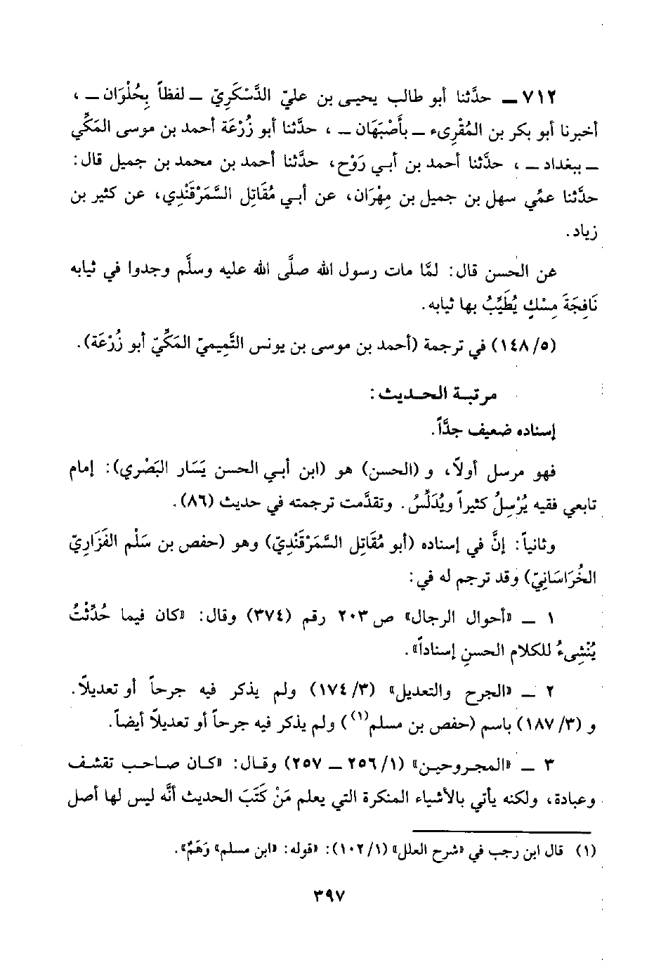 ٧١٢ - حدَّثنا أبو طالب يحيى بن عليّ الدَّسْكْرِيّ -لفظًا بِحُلْوَان-، أخبرنا أبو بكر بن المُقْرئ -بأَصْبَهَان-، حدَّثنا أبو زُرْعَة أحمد بن موسى المَكِّي -ببغداد-، حدَّثنا أحمد بن أبي رَوْح، حدَّثنا أحمد بن محمد بن جميل قال: حدَّثنا عمِّي سهل بن جميل بن مِهْرَان، عن أبي مُقَاتِل السَّمَرْقَنْدِي، عن كثير بن زياد.