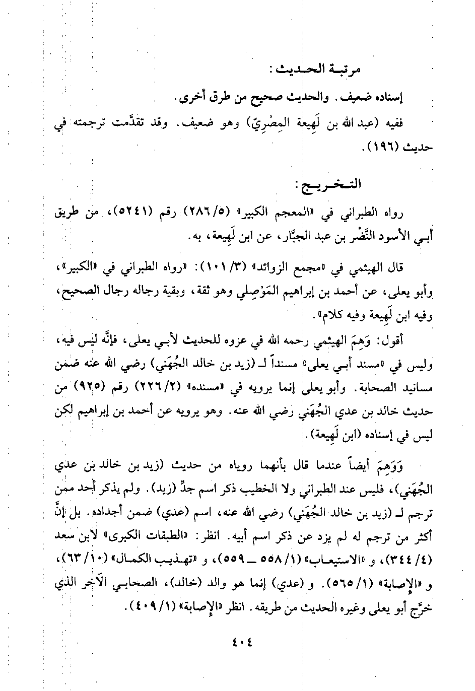 وَوَهِمَ أيضًا عندما قال بأنهما روياه من حديث (زيد بن خالد بن عدي الجُهَني)، فليس عند الطبراني ولا الخطيب ذكر اسم جدِّ (زيد). ولم يذكر أحد ممن ترجم لـ (زيد بن خالد الجُهَني) رضي اللَّه عنه، اسم (عدي) ضمن أجداده. بل إنَّ أكثر من ترجم له لم يزد عن ذكر اسم أبيه. انظر: "الطبقات الكبرى" لابن سعد (٤/ ٣٤٤)، و"الاستيعاب" (١/ ٥٥٨ - ٥٥٩)، و"تهذيب الكمال" (١٠/ ٦٣)، و"الإصابة" (١/ ٥٦٥). و (عدي) إنما هو والد (خالد)، الصحابي الآخر الذي خرَّج أبو يعلى وغيره الحديث من طريقه. انظر "الإصابة" (١/ ٤٠٩).