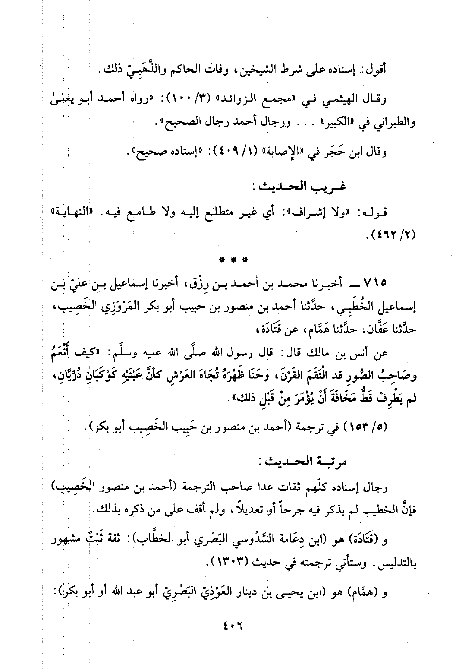 ٧١٥ - أخبرنا محمد بن أحمد بن رِزْق، أخبرنا إسماعيل بن عليّ بن إسماعيل الخُطَبِي، حدَّثنا أحمد بن منصور بن حبيب أبو بكر المَرْوَزِي الخَصِيب، حدَّثنا عَفَّان، حدَّثنا هَمَّام، عن قَتَادَة،