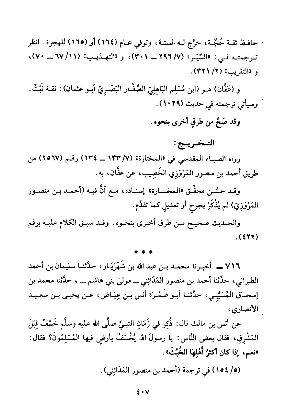 ٧١٦ - أخبرنا محمد بن عبد اللَّه بن شَهْرَيَار، حدَّثنا سليمان بن أحمد الطبراني، حدَّثنا أحمد بن منصور المَدَائِني -مولى بني هاشم-، حدَّثنا محمد بن إسحاق المُسَيَّبِي، حدَّثنا أبو ضَمْرَة أنس بن عِيَاض، عن يحيى بن سعيد الأنصاري،