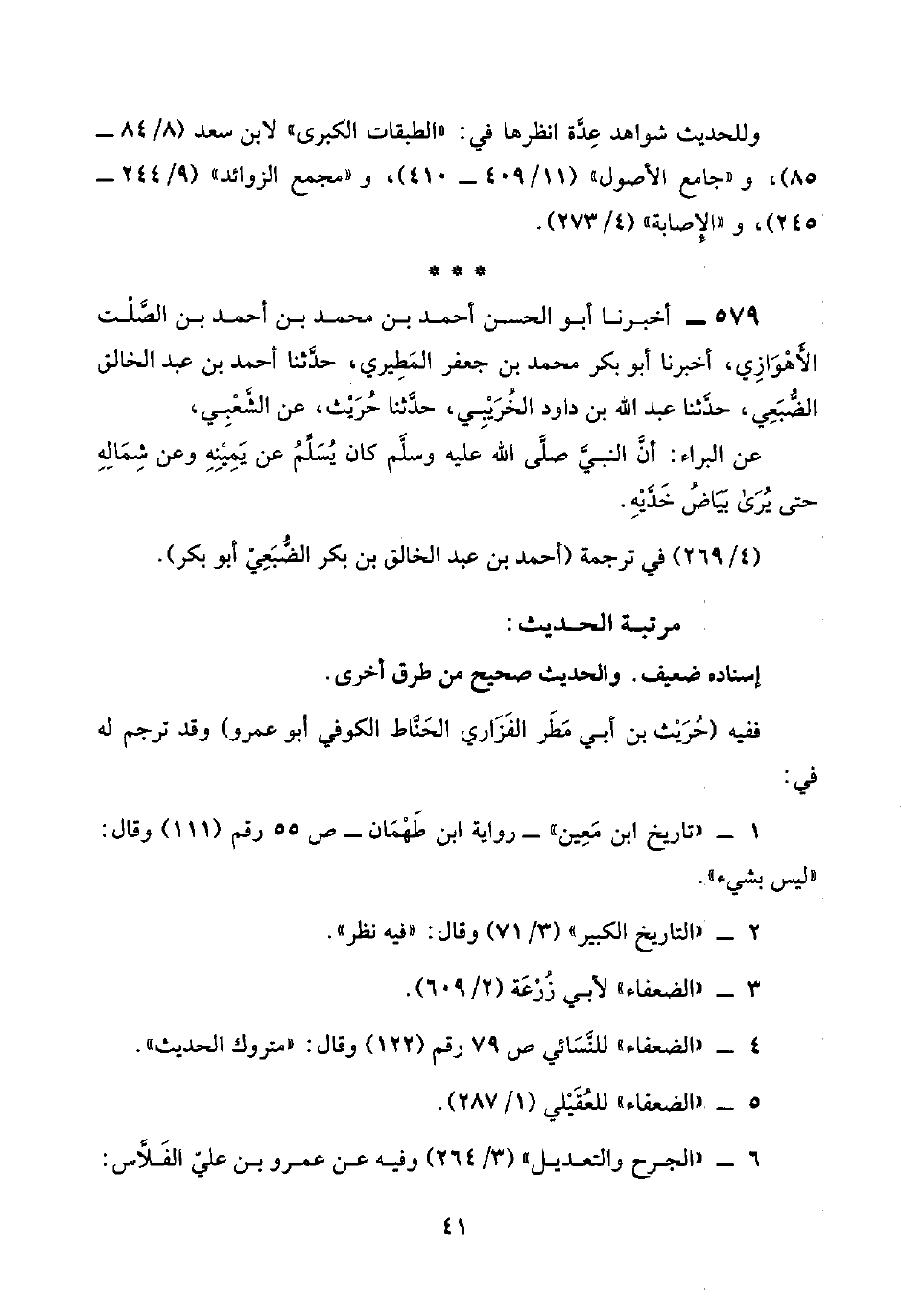 ٥٧٩ - أخبرنا أبو الحسن أحمد بن محمد بن أحمد بن الصَّلْت الأَهْوَازِي، أخبرنا أبو بكر محمد بن جعفر المَطِيري، حدَّثنا أحمد بن عبد الخالق الضُّبَعِي، حدَّثنا عبد اللَّه بن داود الخُرَيْبِي، حدَّثنا حُرَيْث، عن الشَّعْبِيّ،