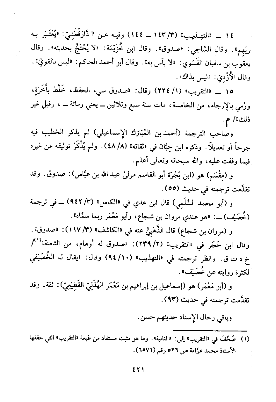 ١٤ - "التهذيب" (٣/ ١٤٣ - ١٤٤) وفيه عن الدَّارَقُطْنِيّ: "يُعْتَبَر به ويَهِم". وقال السَّاجي: "صدوق". وقال ابن خُزَيْمَة: "لا يُحْتَجُّ بحديثه". وقال يعقوب بن سفيان الفَسَوي: "لا بأس به". وقال أبو أحمد الحاكم: "ليس بالقويِّ". وقال الأَزْدِيّ: "ليس بذاك".