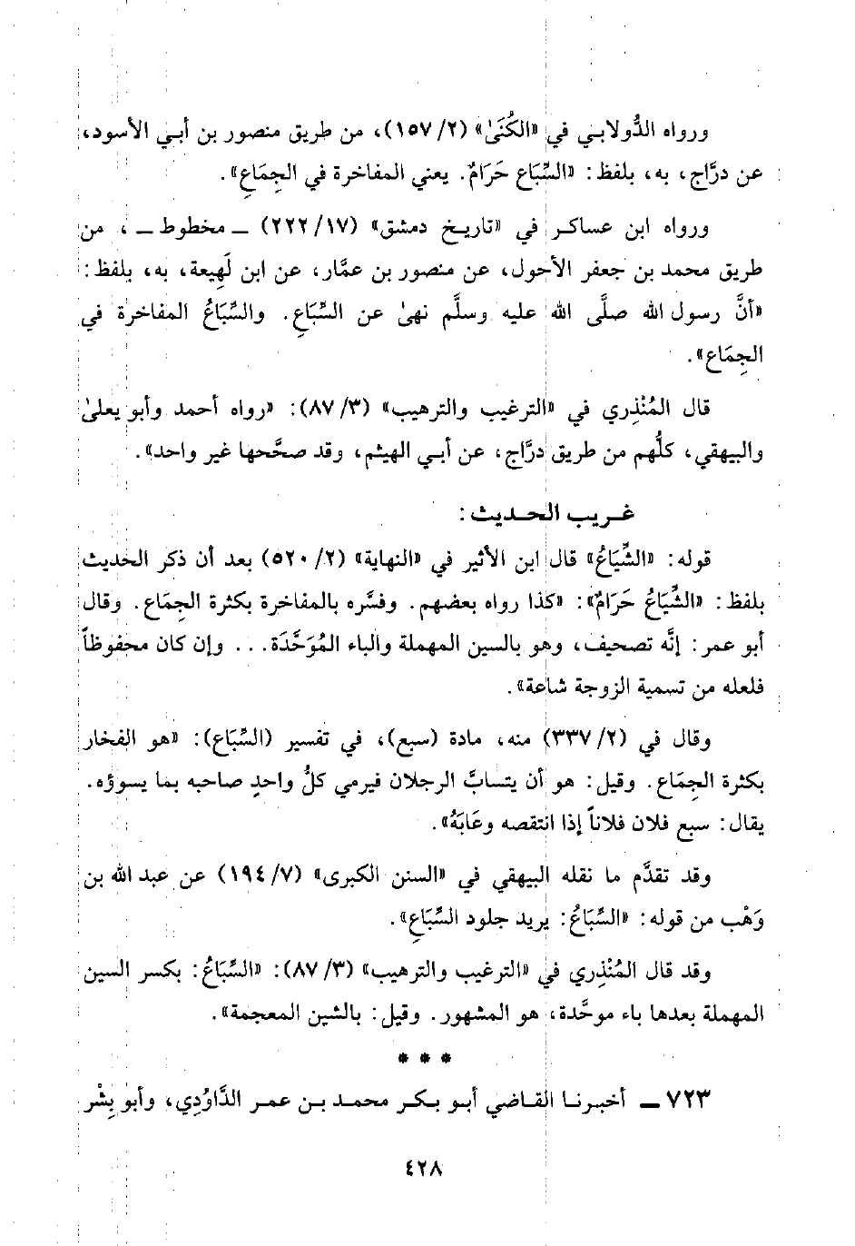 وقد قال المُنْذِري في "الترغيب والترهيب" (٣/ ٨٧): "السِّبَاعُ: بكسر السين المهملة بعدها باء موحَّدة، هو المشهور. وقيل: بالشين المعجمة".