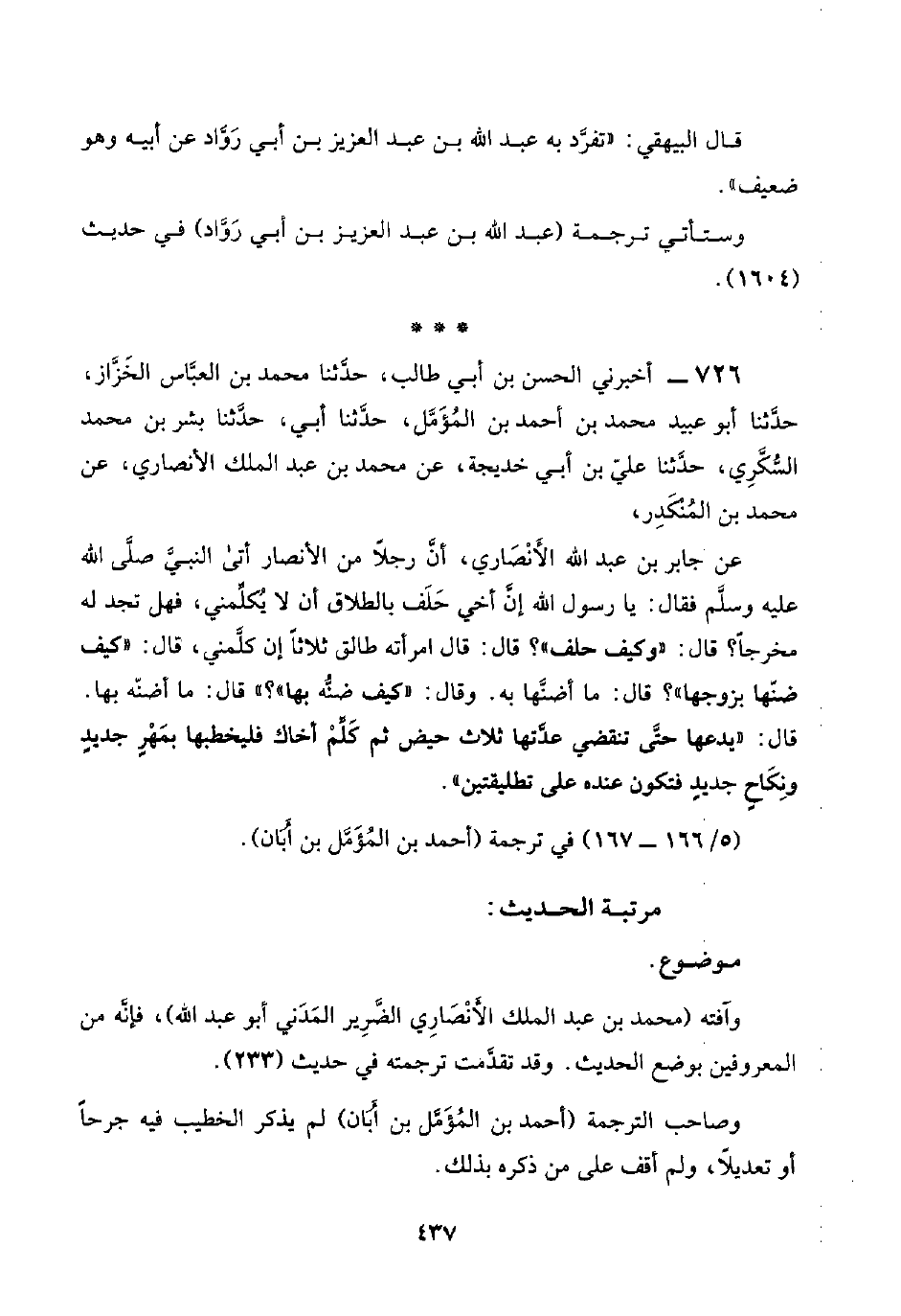عن جابر بن عبد اللَّه الأَنْصَارِي، أنَّ رجلًا من الأنصار أتى النبيَّ صلَّى اللَّه عليه وسلَّم فقال: يا رسول اللَّه إنَّ أخي حَلَف بالطلاق أن لا يُكَلِّمني، فهل تجد له مخرجًا؟ قال: "وكيف حلف"؟ قال: قال امرأته طالق ثلاثًا إن كلَّمني، قال: "كيف ضنّها بزوجها"؟ قال: ما أضنَّها به. وقال: "كيف ضنُّه بها"؟ " قال: ما أضنّه بها. قال: "يدعها حتَّى تنقضي عدَّتها ثلاث حيض ثم كَلِّمْ أخاك فليخطبها بمَهْرٍ جديدٍ ونِكَاحٍ جديدٍ فتكون عنده على تطليقتين".