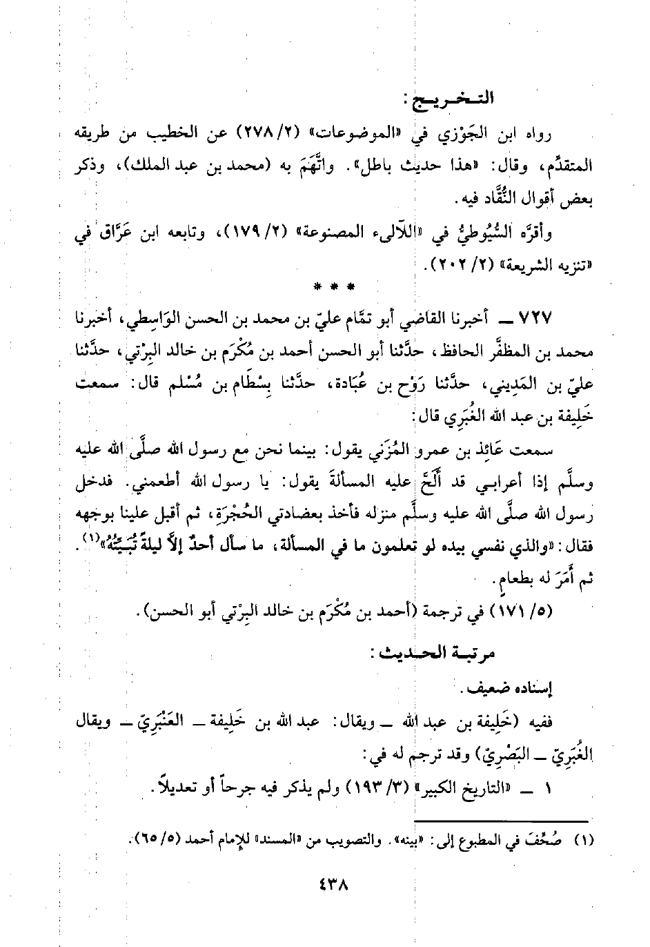 ٧٢٧ - أخبرنا القاضي أبو تمَّام عليّ بن محمد بن الحسن الوَاسِطي، أخبرنا محمد بن المظفَّر الحافظ، حدَّثنا أبو الحسن أحمد بن مُكْرَم بن خالد البِرْتي، حدَّثنا عليّ بن المَدِيني، حدَّثنا روح بن عُبَادة، حدَّثنا بِسْطَام بن مُسْلم قال: سمعت خَلِيفة بن عبد اللَّه الغُبَرِي قال: