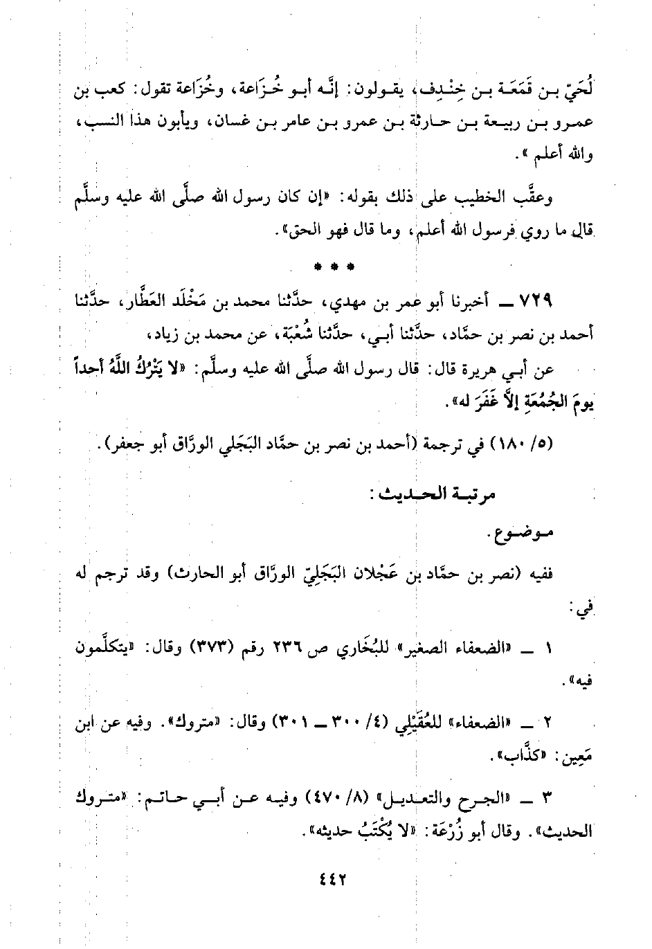 ٧٢٩ - أخبرنا أبو عمر بن مهدي، حدَّثنا محمد بن مَخْلَد العَطَّار، حدَّثنا أحمد بن نصر بن حمَّاد، حدَّثنا أبي، حدَّثنا شُعْبَة، عن محمد بن زياد،