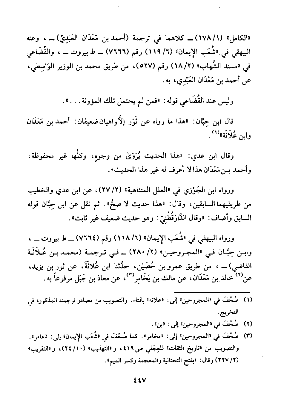 وقال ابن عدي: هذا الحديث يُرْوَى من وجوهٍ، وكلُّها غير محفوظة، وأحمد بن مَعْدَان هذا لا أعرف له غير هذا الحديث".