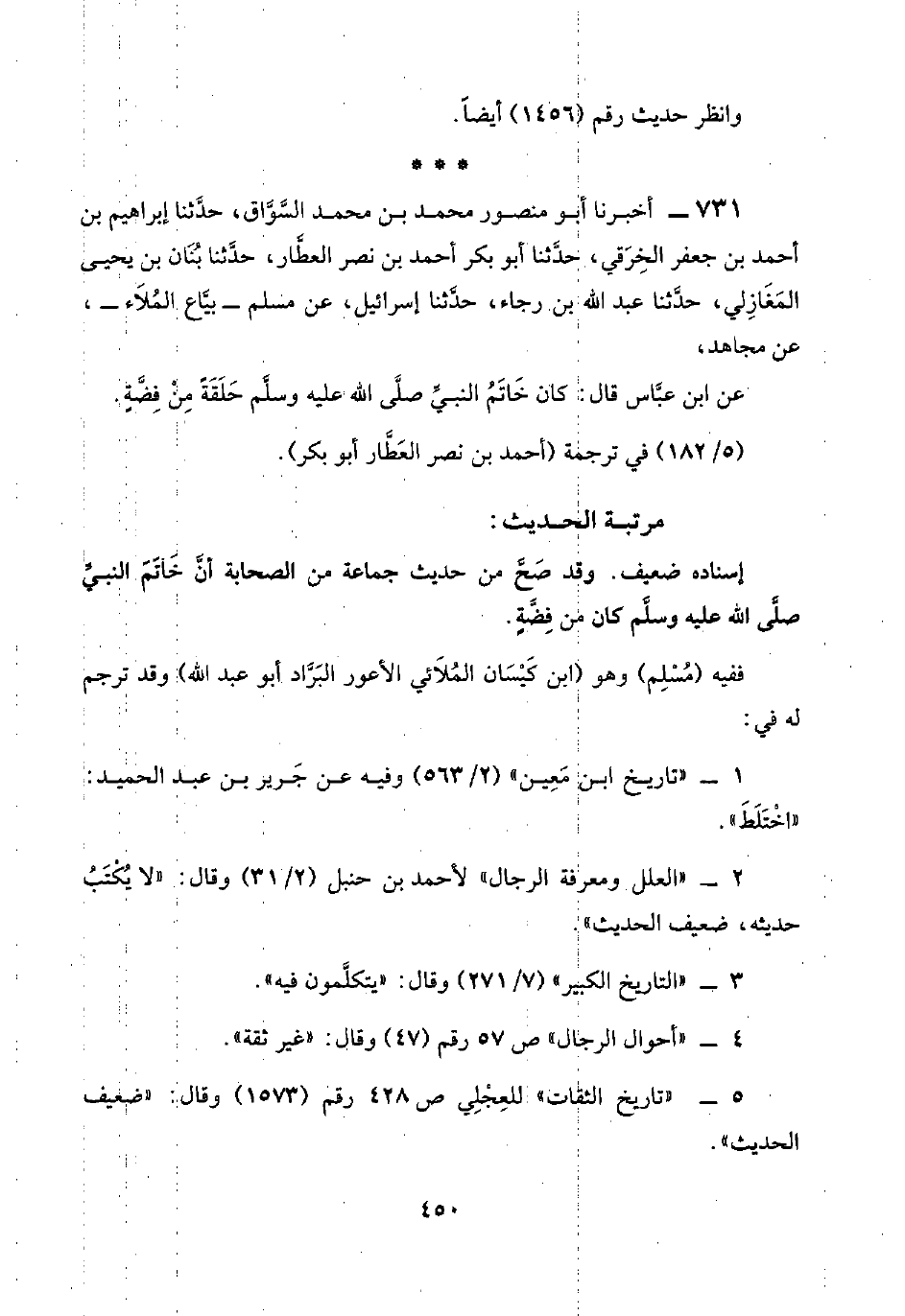 ٧٣١ - أخبرنا أبو منصور محمد بن محمد السَّوَّاق، حدَّثنا إبراهيم بن أحمد بن جعفر الخِرَقي، حدَّثنا أبو بكر أحمد بن نصر العَطَّار، حدَّثنا بُنَان بن يحيى المَغَازِلِي، حدَّثنا عبد اللَّه بن رجاء، حدَّثنا إسرائيل، عن مسلم -بيَّاع المُلَاء-، عن مجاهد،