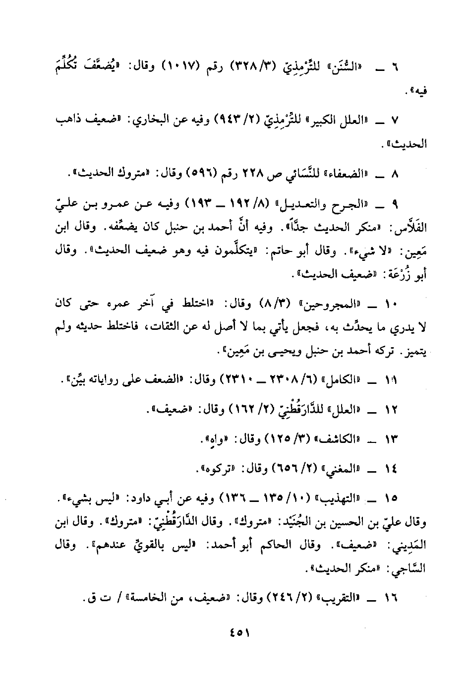 ٩ - "الجرح والتعديل" (٨/ ١٩٢ - ١٩٣) وفيه عن عمرو بن عليّ الفَلَّاس: "منكر الحديث جدًّا". وفيه أنَّ أحمد بن حنبل كان يضعِّفه. وقال ابن مَعِين: "لا شيء". وقال أبو حاتم: "يتكلَّمون فيه وهو ضعيف الحديث". وقال أبو زُرْعَة: "ضعيف الحديث".