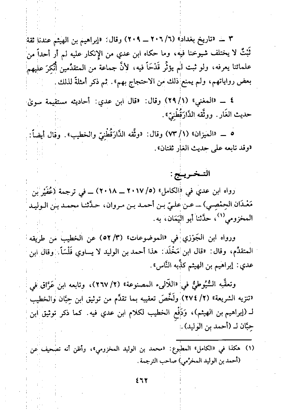 وتعقَّبه السُّيُوطِيُّ في "اللآلئ المصنوعة" (٢/ ٢٦٧)، وتابعه ابن عَرَّاق في "تنزيه الشريعة" (٢/ ٢٧٤)، ولَخَّصَ تعقيبه بما تقدَّم من توثيق ابن حِبَّان والخطيب لـ (إبراهيم بن الهيثم)، وَدَفْعِ الخطيب لكلام ابن عدي فيه. كما ذكر توثيق ابن حِبَّان لـ (أحمد بن الوليد).
