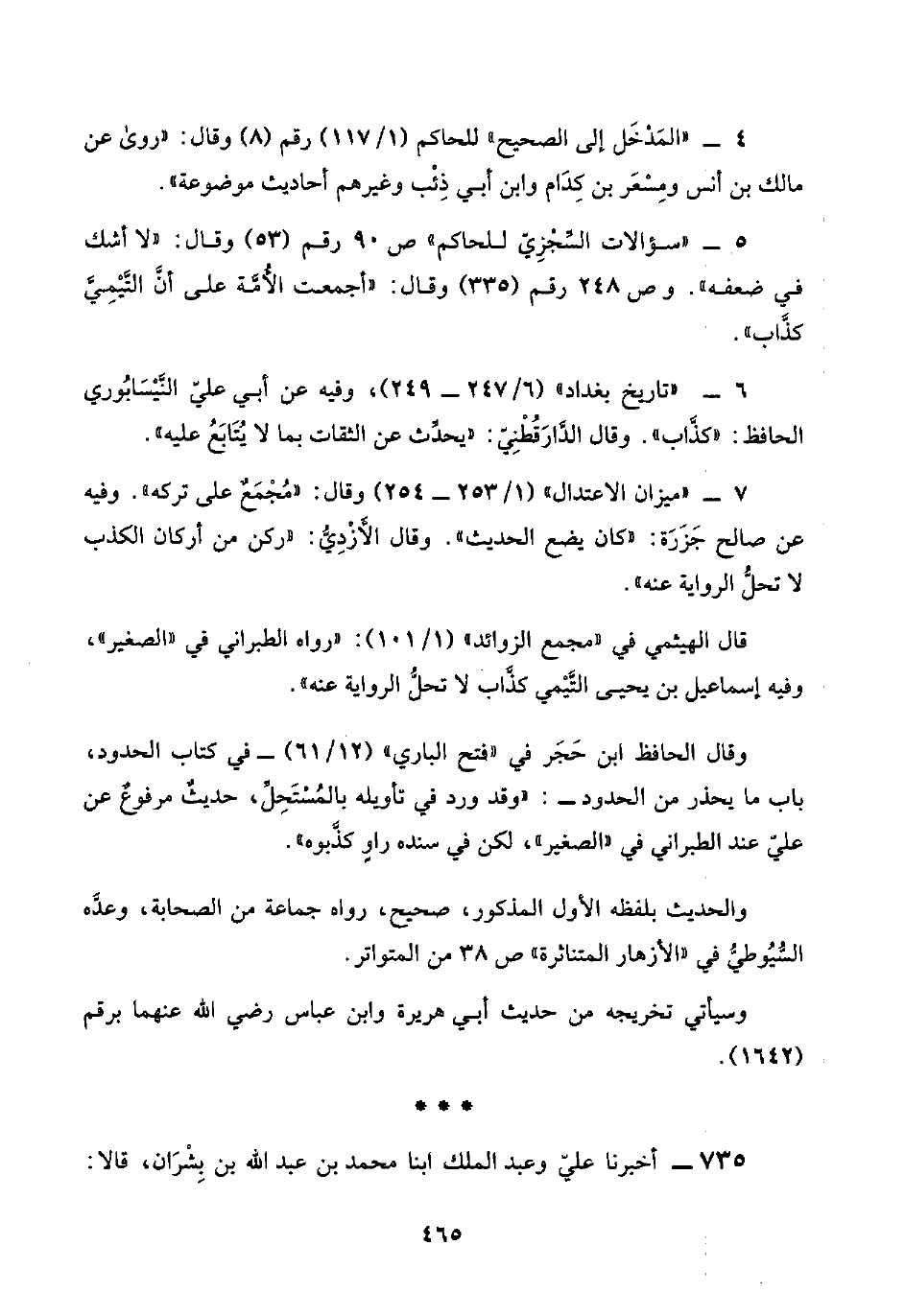 ٥ - "سؤالات السِّجْزِيّ للحاكم" ص ٩٠ رقم (٥٣) وقال: "لا أشك في ضعفه". وص ٢٤٨ رقم (٣٣٥) وقال: "أجمعت الأُمَّة على أنَّ التَّيْمِيَّ كذَّاب".
