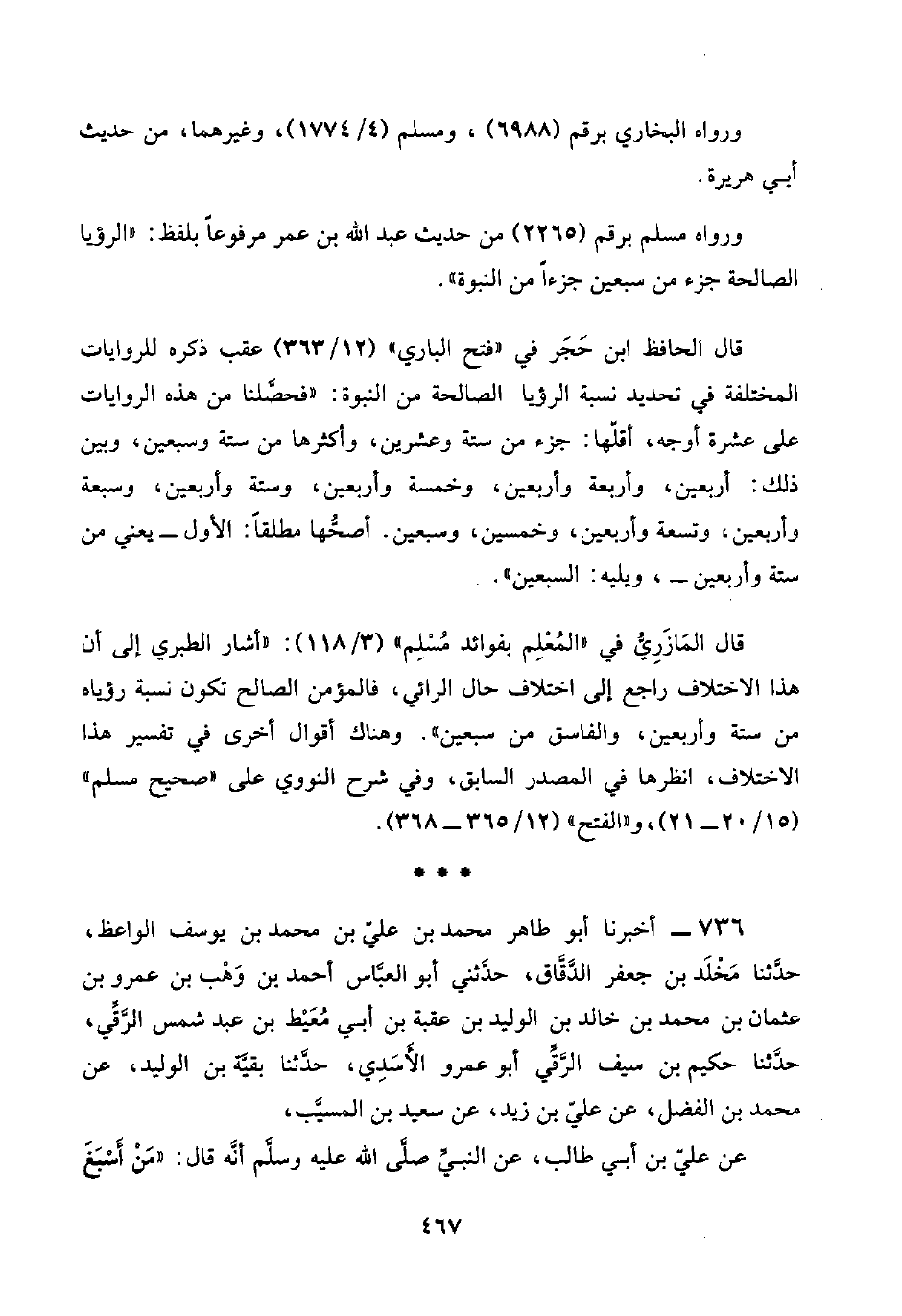قال الحافظ ابن حَجَر في "فتح الباري" (١٢/ ٣٦٣) عقب ذكره للروايات المختلفة في تحديد نسبة الرؤيا الصالحة من النبوة: "فحصَّلنا من هذه الروايات على عشرة أوجه، أقلّها: جزء من ستة وعشرين، وأكثرها من ستة وسبعين، وبين ذلك: أربعين، وأربعة وأربعين، وخمسة وأربعين، وستة وأربعين، وسبعة وأربعين، وتسعة وأربعين، وخمسين، وسبعين. أصحُّها مطلقًا: الأول -يعني من ستة وأربعين-، ويليه: السبعين".