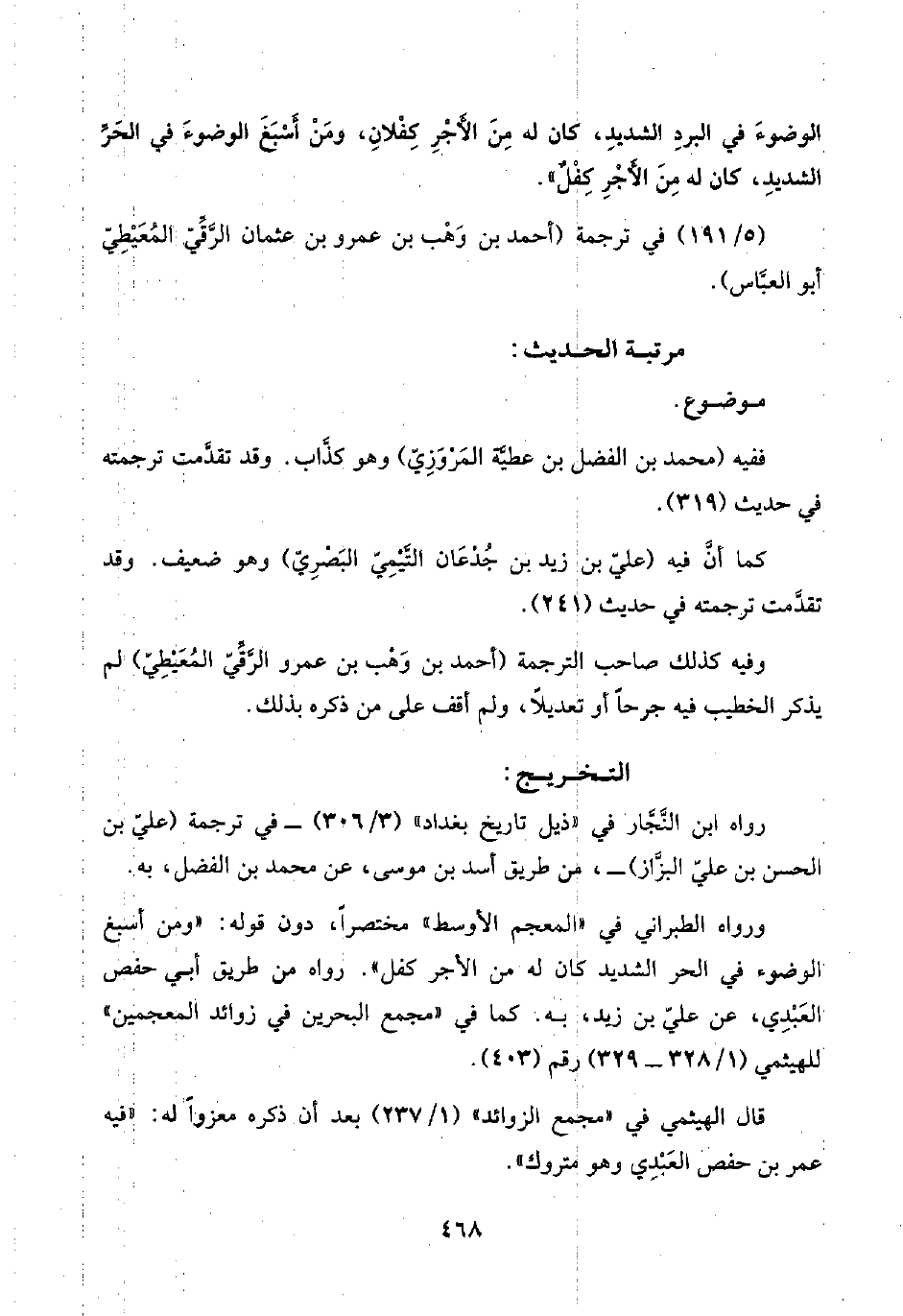 الوضوءَ في البردِ الشديدِ، كان له مِنَ الأَجْرِ كِفْلانِ، ومَنْ أَسْبَغَ الوضوءَ في الحَرِّ الشديدِ، كان له مِنَ الأَجْرِ كِفْلٌ".