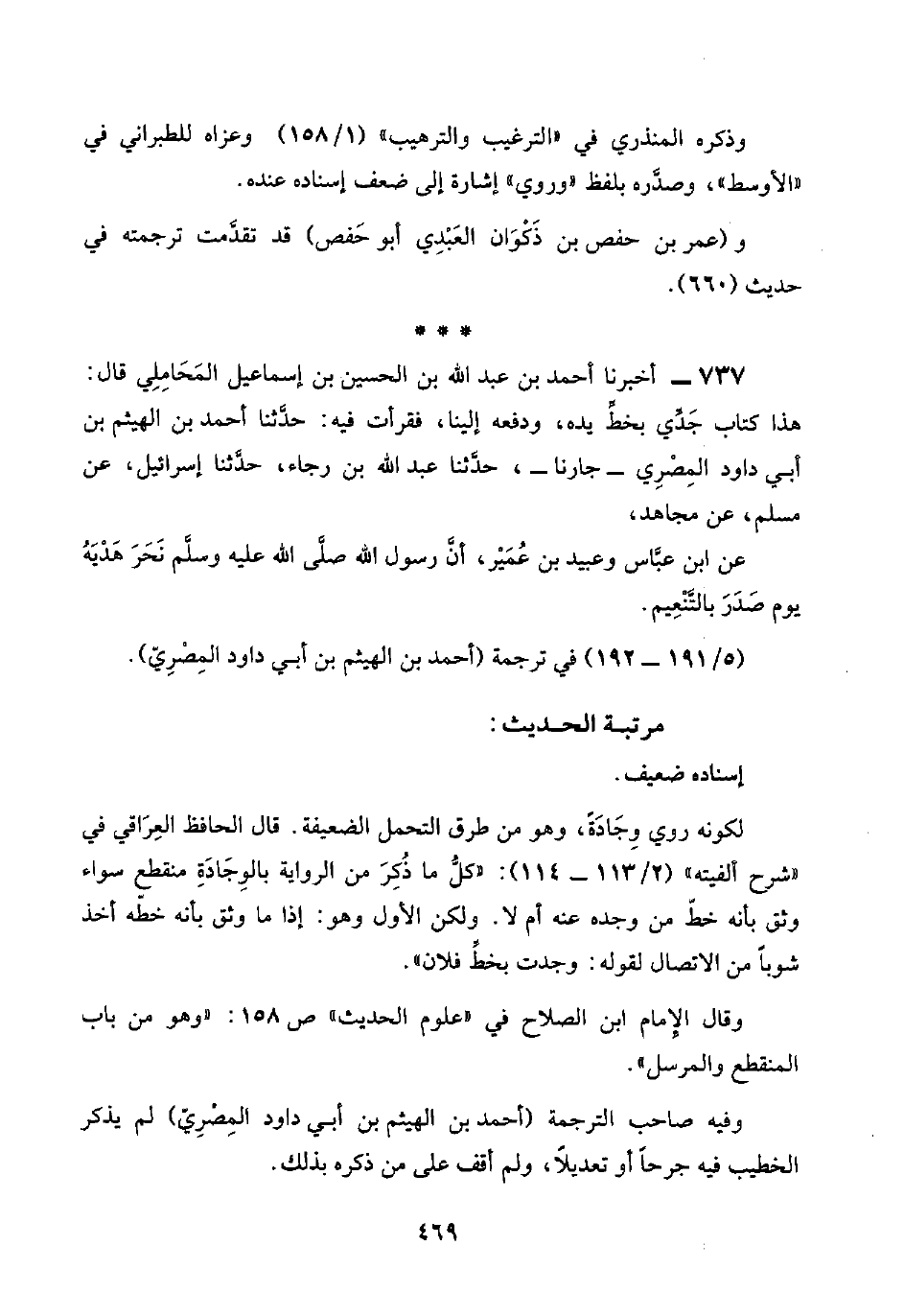٧٣٧ - أخبرنا أحمد بن عبد اللَّه بن الحسين بن إسماعيل المَحَامِلِي قال: هذا كتاب جَدِّي بخطِّ يده، ودفعه إلينا، فقرأت فيه: حدَّثنا أحمد بن الهيثم بن أبي داود المِصْرِي -جارنا-، حدَّثنا عبد اللَّه بن رجاء، حدَّثنا إسرائيل، عن مسلم، عن مجاهد،