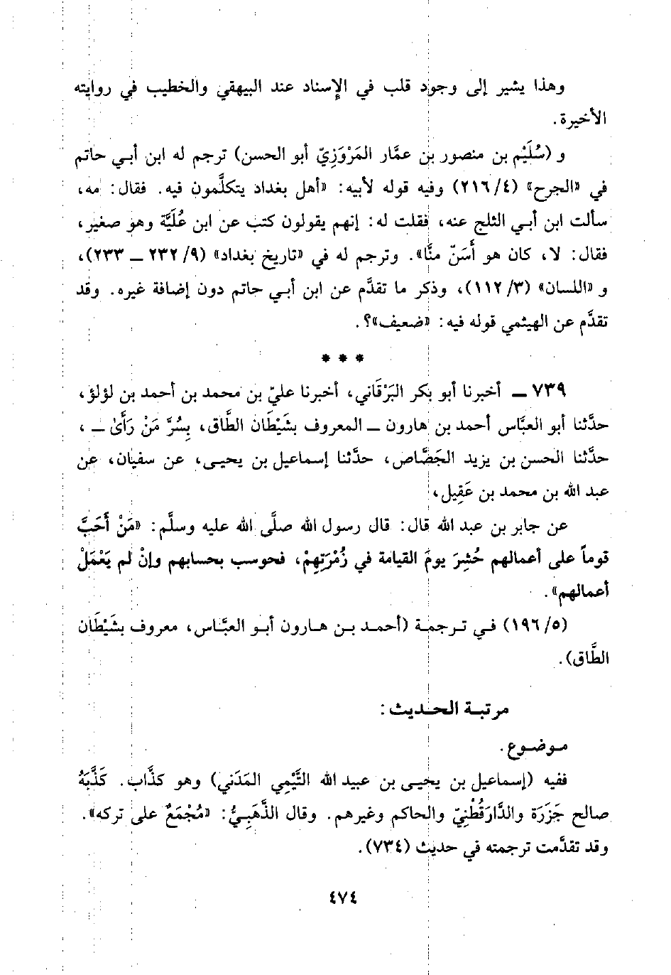 ٧٣٩ - أخبرنا أبو بكر البَرْقَاني، أخبرنا عليّ بن محمد بن أحمد بن لؤلؤ، حدَّثنا أبو العبَّاس أحمد بن هارون -المعروف بشَيْطَان الطَّاق، بِسُرَّ مَنْ رَأَى-، حدَّثنا الحسن بن يزيد الجَصَّاص، حدَّثنا إسماعيل بن يحيى، عن سفيان، عن عبد اللَّه بن محمد بن عَقِيل،