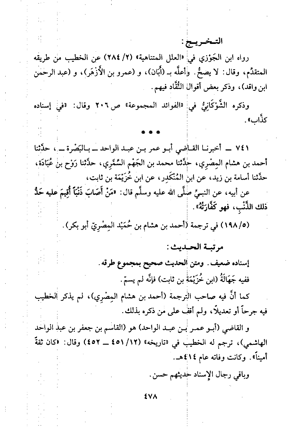 ٧٤١ - أخبرنا القاضي أبو عمر بن عبد الواحد -بالبَصْرة-، حدَّثنا أحمد بن هشام المِصْرِيّ، حدَّثنا محمد بن الجَهْم السِّمَّرِي، حدَّثنا روح بن عُبَادَة، حدَّثنا أسامة بن زيد، عن ابن المُنْكَدِر، عن ابن خُزَيْمَة بن ثابت،