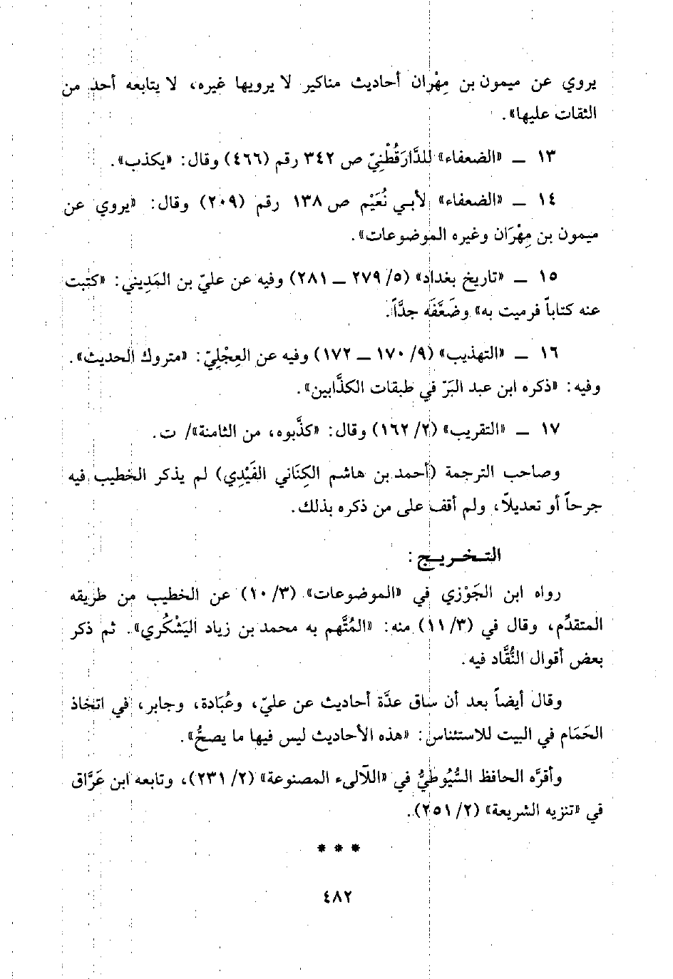 ١٤ - "الضعفاء" لأبي نُعَيْم ص ١٣٨ رقم (٢٠٩) وقال: "يروي عن ميمون بن مِهْرَان وغيره الموضوعات".