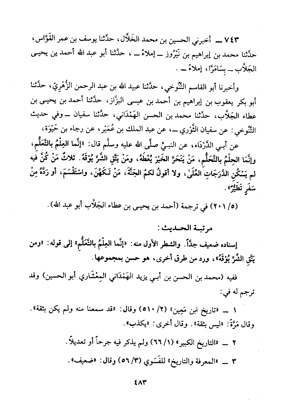 ٧٤٣ - أخبرني الحسين بن محمد الخَلَّال، حدَّثنا يوسف بن عمر القَوَّاس، حدَّثنا محمد بن إبراهيم بن نَيْرُوز -إملاءً-، حدَّثنا أبو عبد اللَّه أحمد بن يحيى الجَلَّاب -بِسَامَرَّا، إملاءً-.