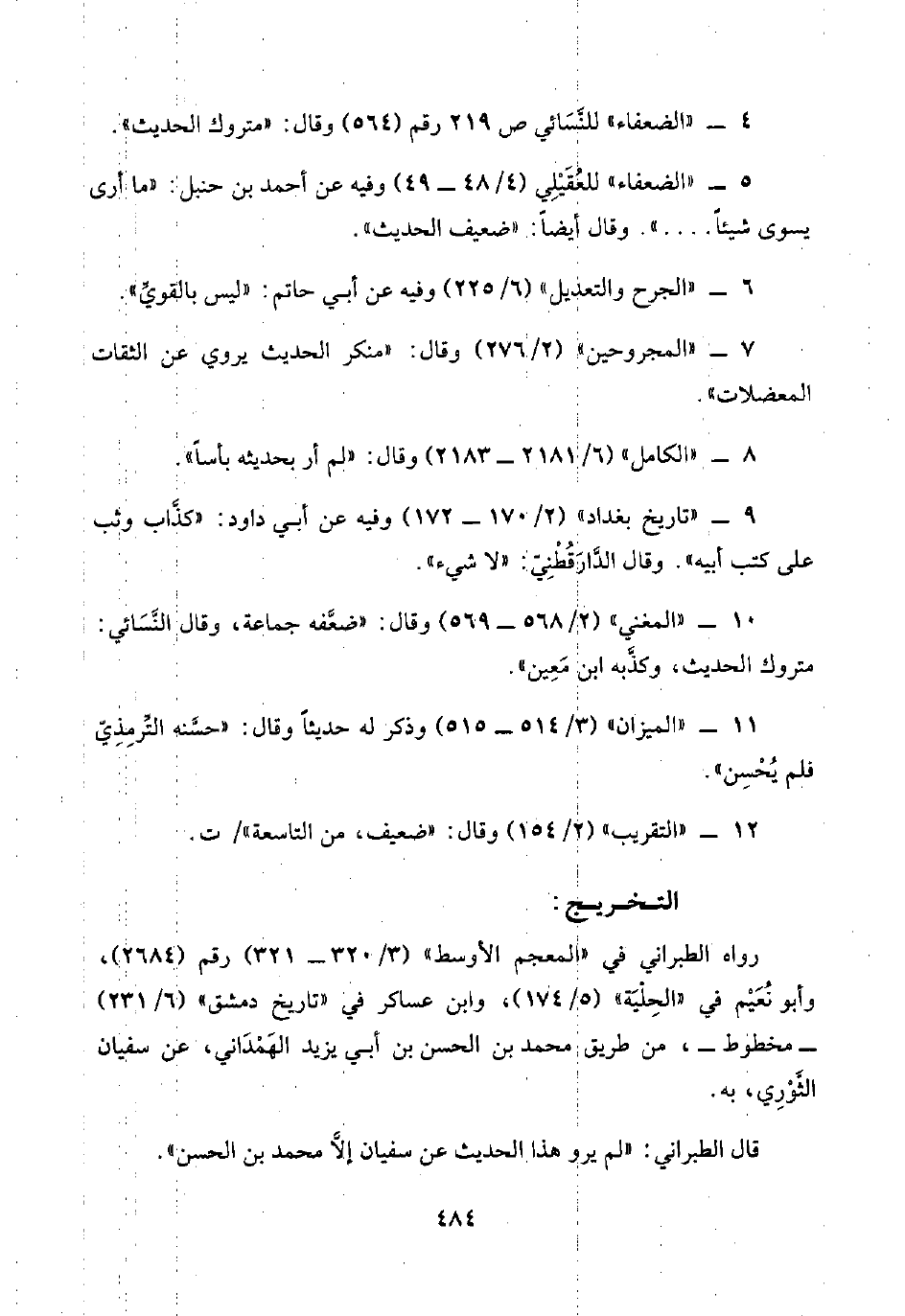 ١٠ - "المغني" (٢/ ٥٦٨ - ٥٦٩) وقال: "ضعَّفه جماعة، وقال النَّسَائي: متروك الحديث، وكذَّبه ابن مَعِين".