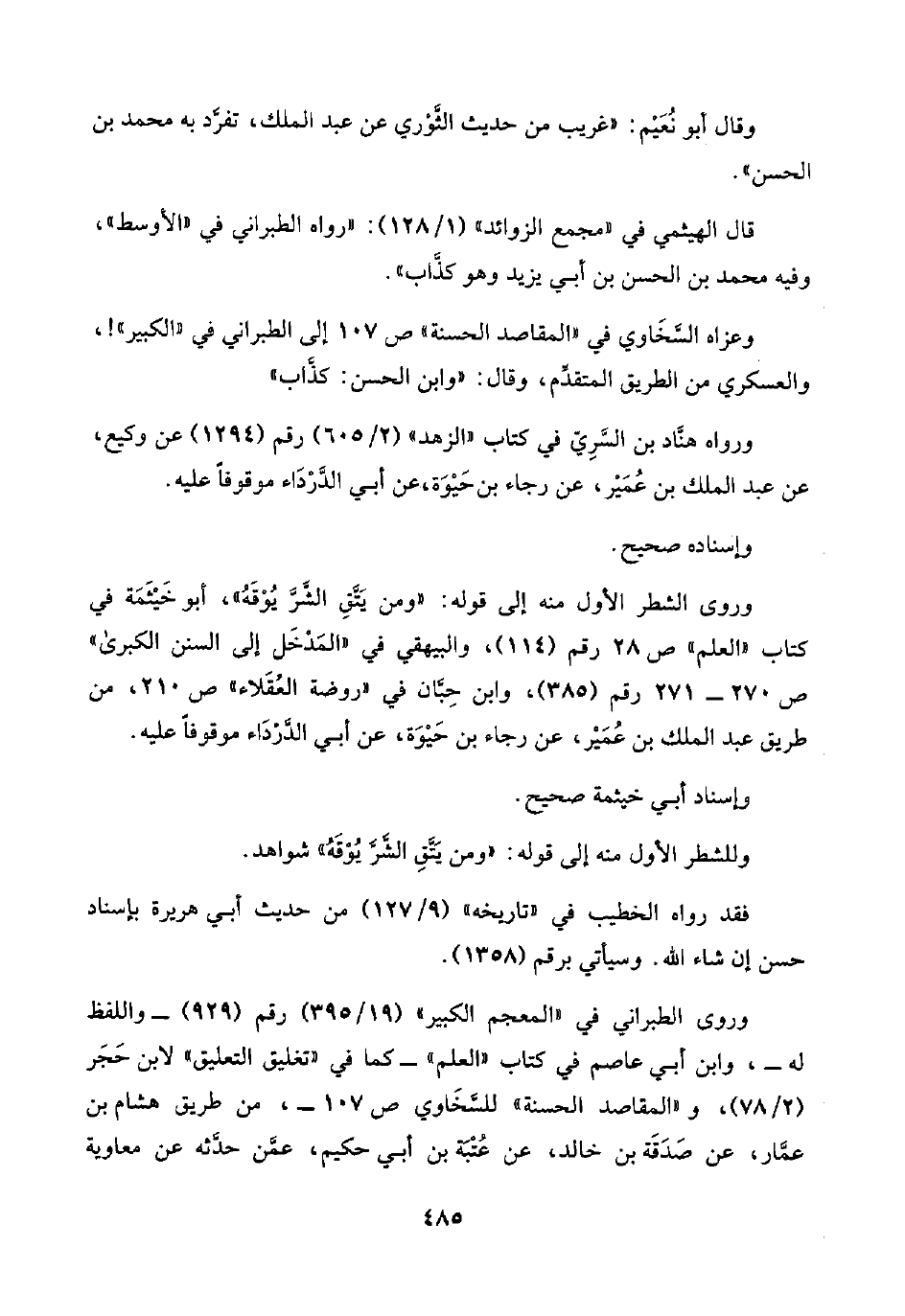 وروى الشطر الأول منه إلى قوله: "ومن يَتَّقِ الشَّرَّ يُوْقَهُ"، أبو خَيْثَمَة في كتاب "العلم" ص ٢٨ رقم (١١٤)، والبيهقي في "المَدْخَل إلى السنن الكبرى" ص ٢٧٠ - ٢٧١ رقم (٣٨٥)، وابن حِبَّان في "روضة العُقَلاء" ص ٢١٠، من طريق عبد الملك بن عُمَيْر، عن رجاء بن حَيْوَة، عن أبي الدَّرْدَاء موقوفًا عليه.