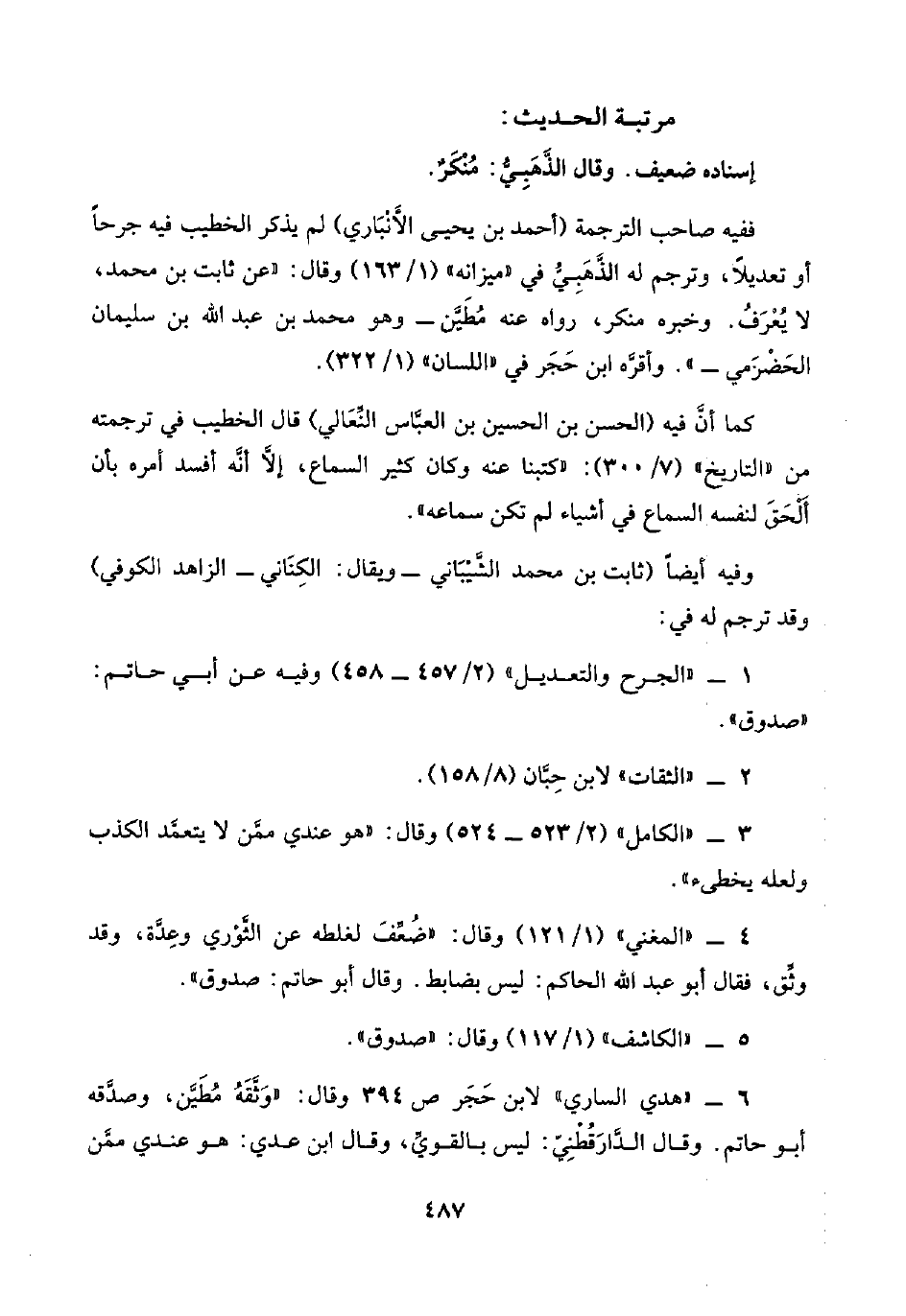٦ - "هدي الساري" لابن حَجَر ص ٣٩٤ وقال: "وَثَّقَهُ مُطَيَّن، وصدَّقه أبو حاتم. وقال الدَّارَقُطْنِيّ: ليس بالقويِّ، وقال ابن عدي: هو عندي ممَّن
