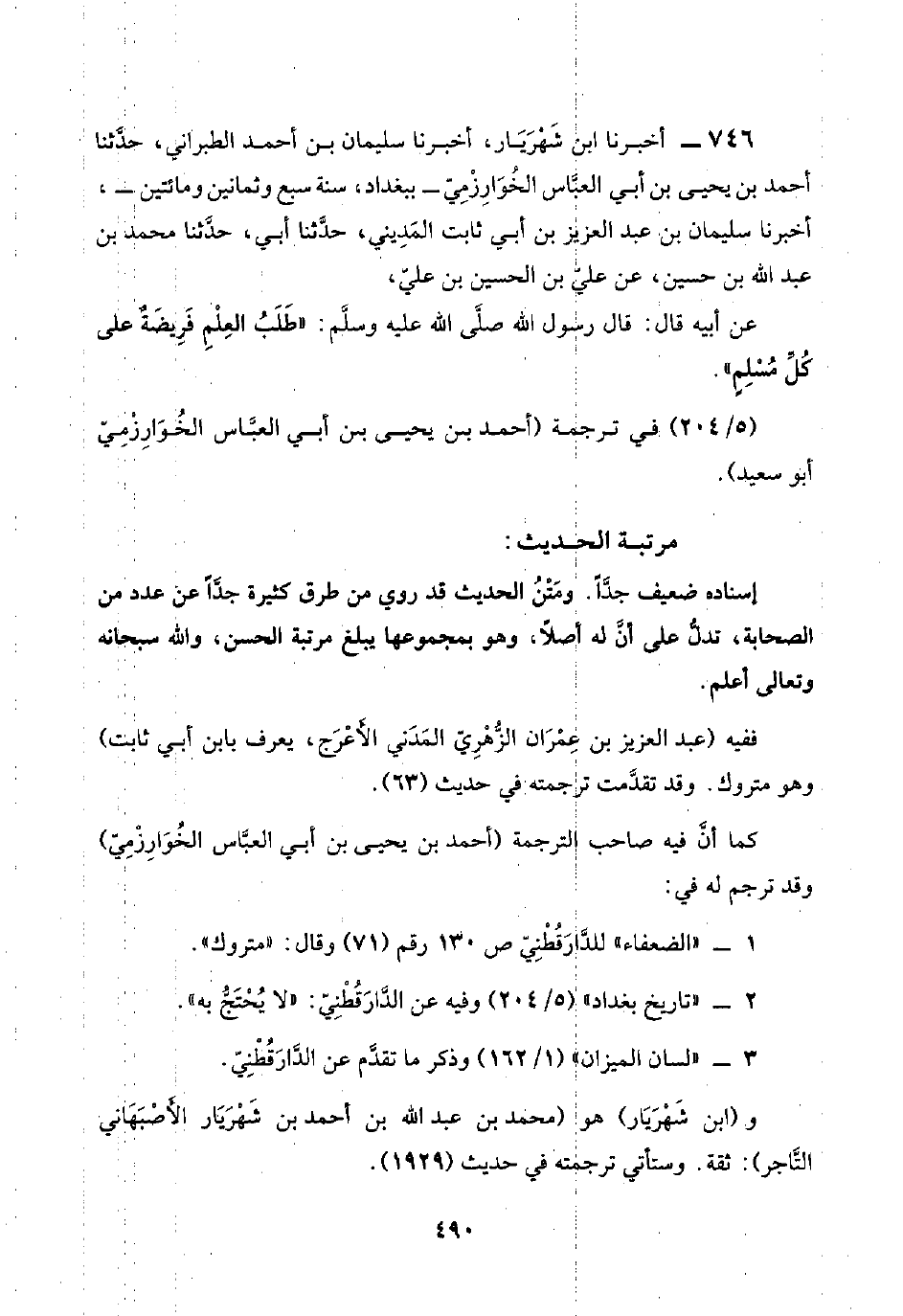 ٧٤٦ - أخبرنا ابن شَهْرَيَار، أخبرنا سليمان بن أحمد الطبراني، حدَّثنا أحمد بن يحيى بن أبي العبَّاس الخُوَارِزْمِيّ -ببغداد، سنة سبع وثمانين ومائتين-، أخبرنا سليمان بن عبد العزيز بن أبي ثابت المَدِيني، حدَّثنا أبي، حدَّثنا محمد بن عبد اللَّه بن حسين، عن عليّ بن الحسين بن عليّ،