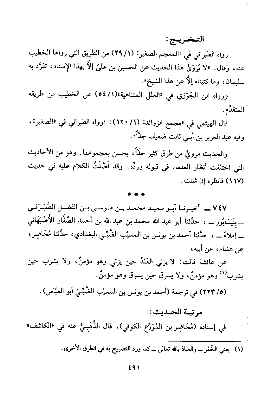 ٧٤٧ - أخبرنا أبو سعيد محمد بن موسى بن الفضل الصَّيْرَفي -بِنَيْسَابُور-، حدَّثنا أبو عبد اللَّه محمد بن عبد اللَّه بن أحمد الصَّفَّار الأَصْبَهَاني -إملاءً-، حدَّثنا أحمد بن يونس بن المسيَّب الضَّبِّي البغدادي، حدَّثنا مُحَاضِر، عن هشام، عن أبيه،