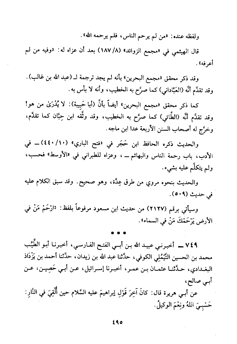 عن أبي هريرة قال: كانَ آخِرَ قَوْلِ إبراهيمَ عليه السَّلام حين أُلْقِيَ في النَّارِ: حَسْبِيَ اللَّهُ ونِعْمَ الوكيلُ.