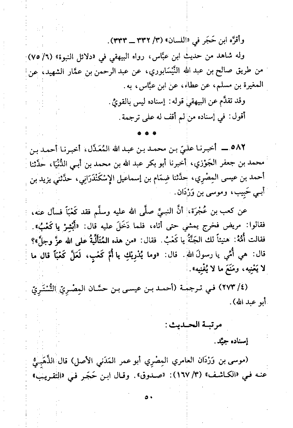 عن كعب بن عُجْرَة، أنَّ النبيَّ صلَّى اللَّه عليه وسلَّم فقد كَعْبًا فسأل عنه، فقالوا: مريض فخرج يمشي حتى أتاه، فلما دَخَلَ عليه قال: "أَبْشِرْ يا كَعْبُ". فقالت أُمُّهُ: هنيئًا لك الجَنَّةُ يا كَعْبُ. فقال: "من هذه المُتَأَلِّيةُ على اللَّه عزَّ وجلَّ"؟ قال: هي أُمِّي يا رسول اللَّه. قال: وما يُدْرِيْكِ يا أُمَّ كَعْبٍ، لَعَلَّ كَعْبًا قال ما لا يَعْنِيه، ومَنَعَ ما لا يُغْنِيه".