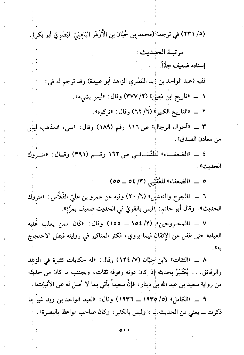 ٩ - "الكامل" (٥/ ١٩٣٥ - ١٩٣٦) وقال: "لعبد الواحد بن زيد غير ما ذكرت -يعني من الحديث-، وليس بالكثير، وكان صاحب مواعظ بالبصرة".