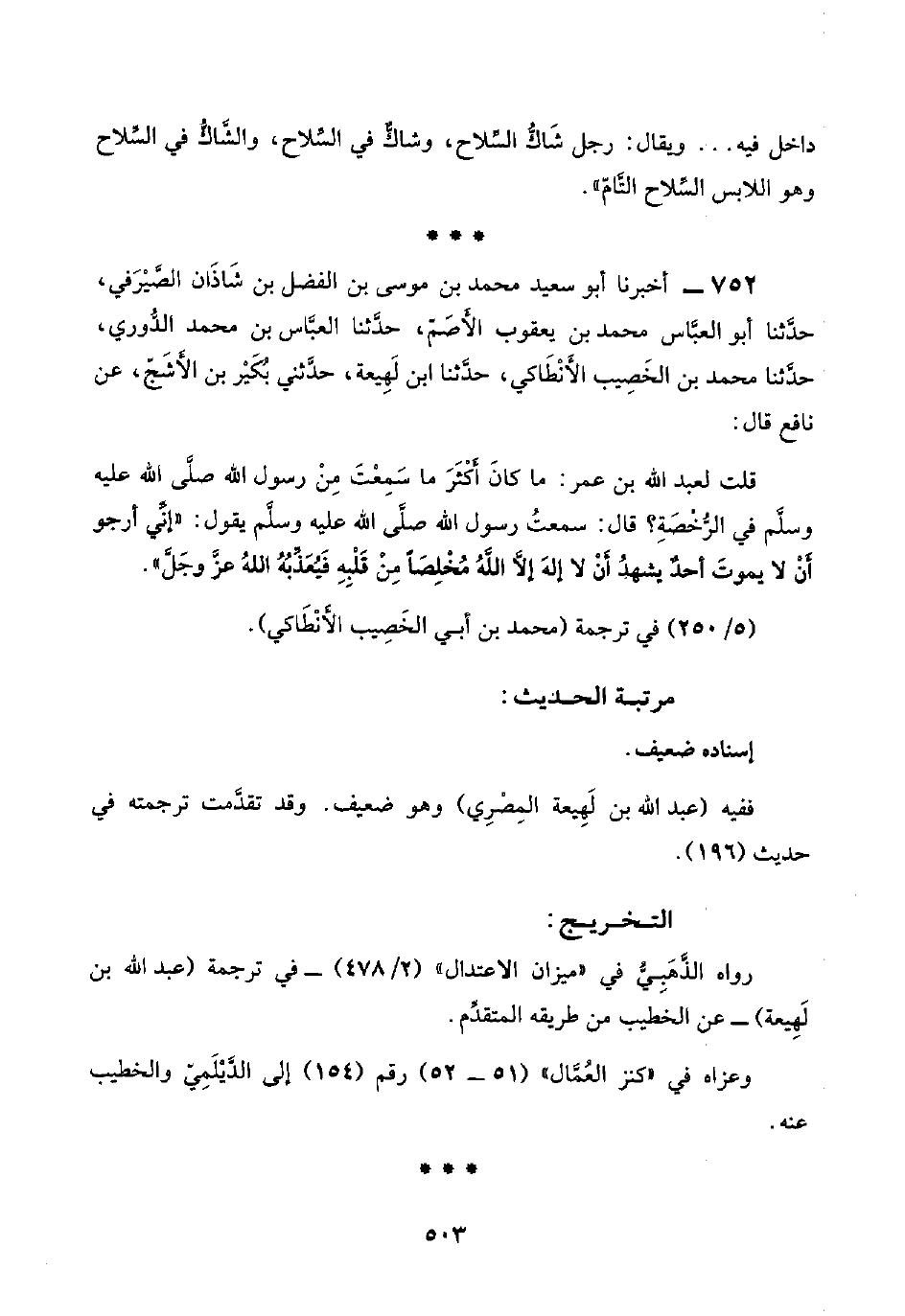 ٧٥٢ - أخبرنا أبو سعيد محمد بن موسى بن الفضل بن شَاذَان الصَّيْرَفي، حدَّثنا أبو العبَّاس محمد بن يعقوب الأَصَمّ، حدَّثنا العبَّاس بن محمد الدُّوري، حدَّثنا محمد بن الخَصِيب الأَنْطَاكي، حدَّثنا ابن لَهِيعة، حدَّثني بُكَيْر بن الأَشَجّ، عن نافع قال: