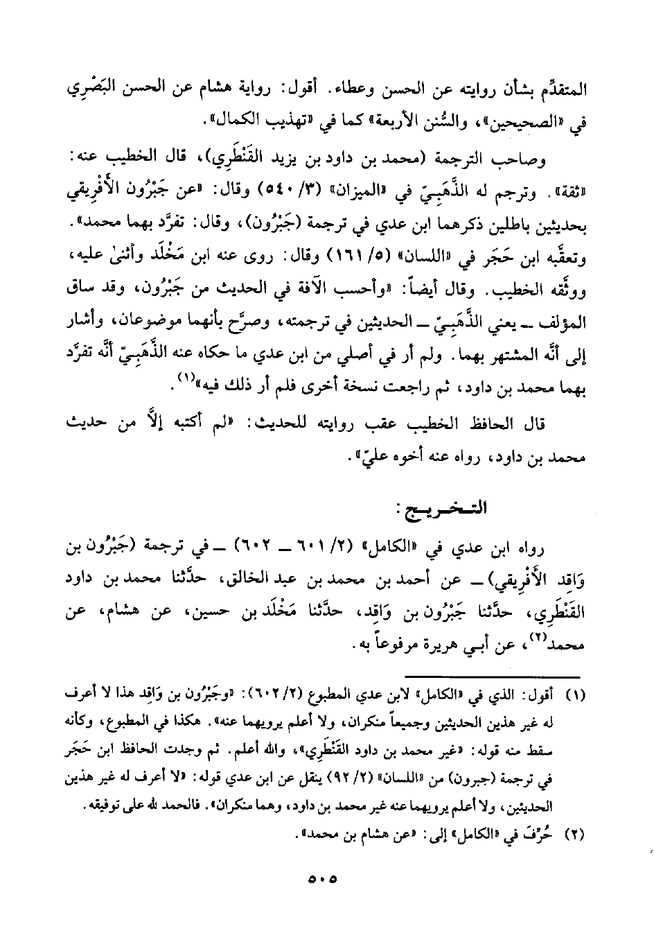 (¬١) أقول: الذي في "الكامل" لابن عدي المطبوع (٢/ ٦٠٢): "وجَبْرُون بن وَاقِد هذا لا أعرف له غير هذين الحديثين وجميعًا منكران، ولا أعلم يرويهما عنه". هكذا في المطبوع، وكأنه سقط منه قوله: "غير محمد بن داود القَنْطَرِي"، واللَّه أعلم. ثم وجدت الحافظ ابن حَجَر في ترجمة (جبرون) من "اللسان" (٢/ ٩٢) ينقل عن ابن عدي قوله: "لا أعرف له غير هذين الحديثين، ولا أعلم يرويهما عنه غير محمد بن داود، وهما منكران". فالحمد للَّه على توفيقه.