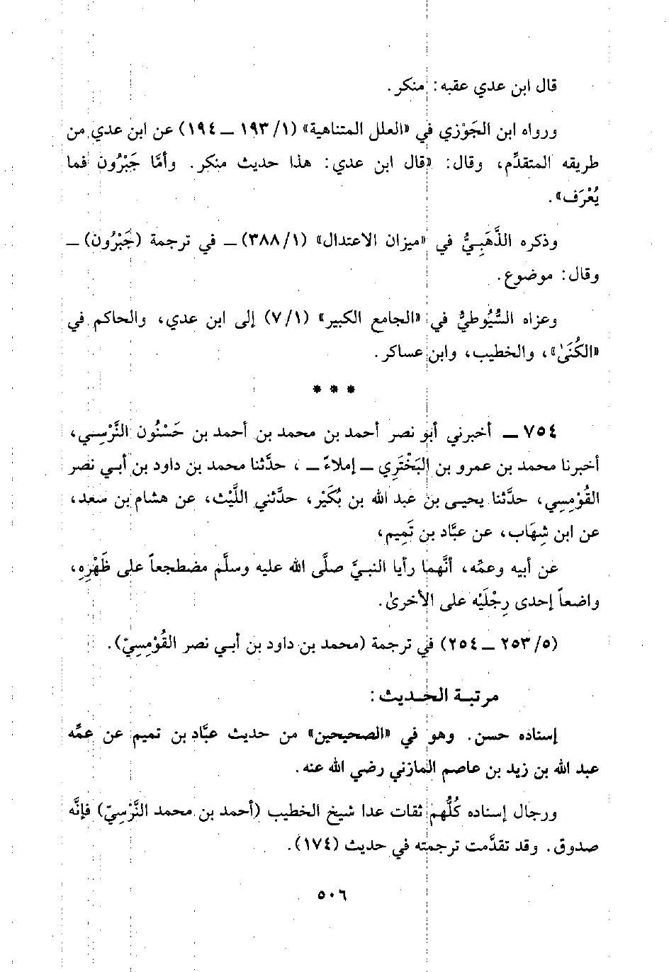 ٧٥٤ - أخبرني أبو نصر أحمد بن محمد بن أحمد بن حَسْنُون النَّرْسِي، أخبرنا محمد بن عمرو بن البَخْتَرِي -إملاءً-، حدَّثنا محمد بن داود بن أبي نصر القُوْمِسِي، حدَّثنا يحيى بن عبد اللَّه بن بُكَيْر، حدَّثني اللَّيْث، عن هشام بن سعد، عن ابن شِهَاب، عن عبَّاد بن تَمِيم،