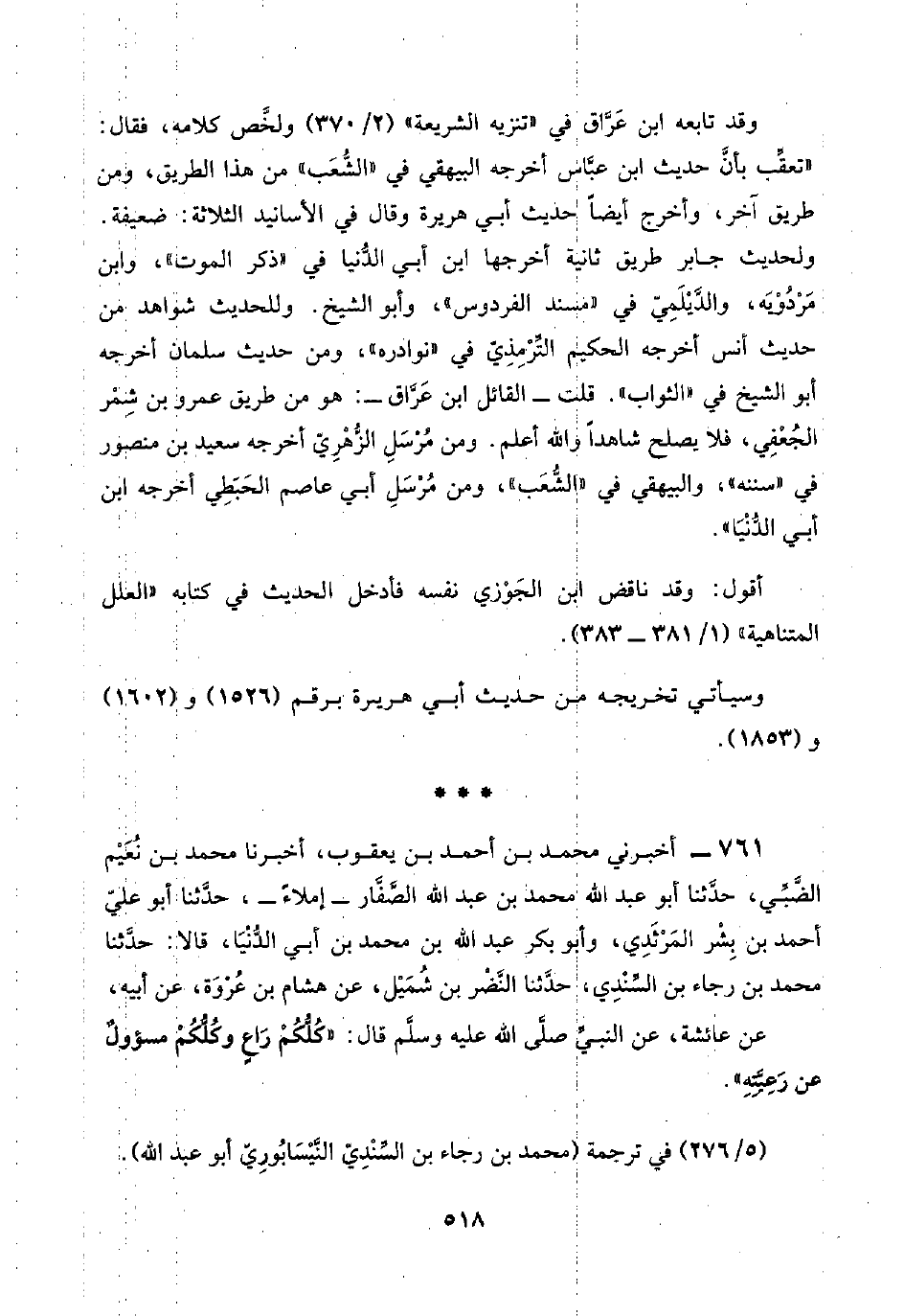 ٧٦١ - أخبرني محمد بن أحمد بن يعقوب، أخبرنا محمد بن نُعَيْم الضَّبِّي، حدَّثنا أبو عبد اللَّه محمد بن عبد اللَّه الصَّفَّار -إملاءً-، حدَّثنا أبو عليّ أحمد بن بِشْر المَرْثَدِي، وأبو بكر عبد اللَّه بن محمد بن أبي الدُّنْيَا، قالا: حدَّثنا محمد بن رجاء بن السِّنْدِي، حدَّثنا النَّضْر بن شُمَيْل، عن هشام بن عُرْوَة، عن أبيه،