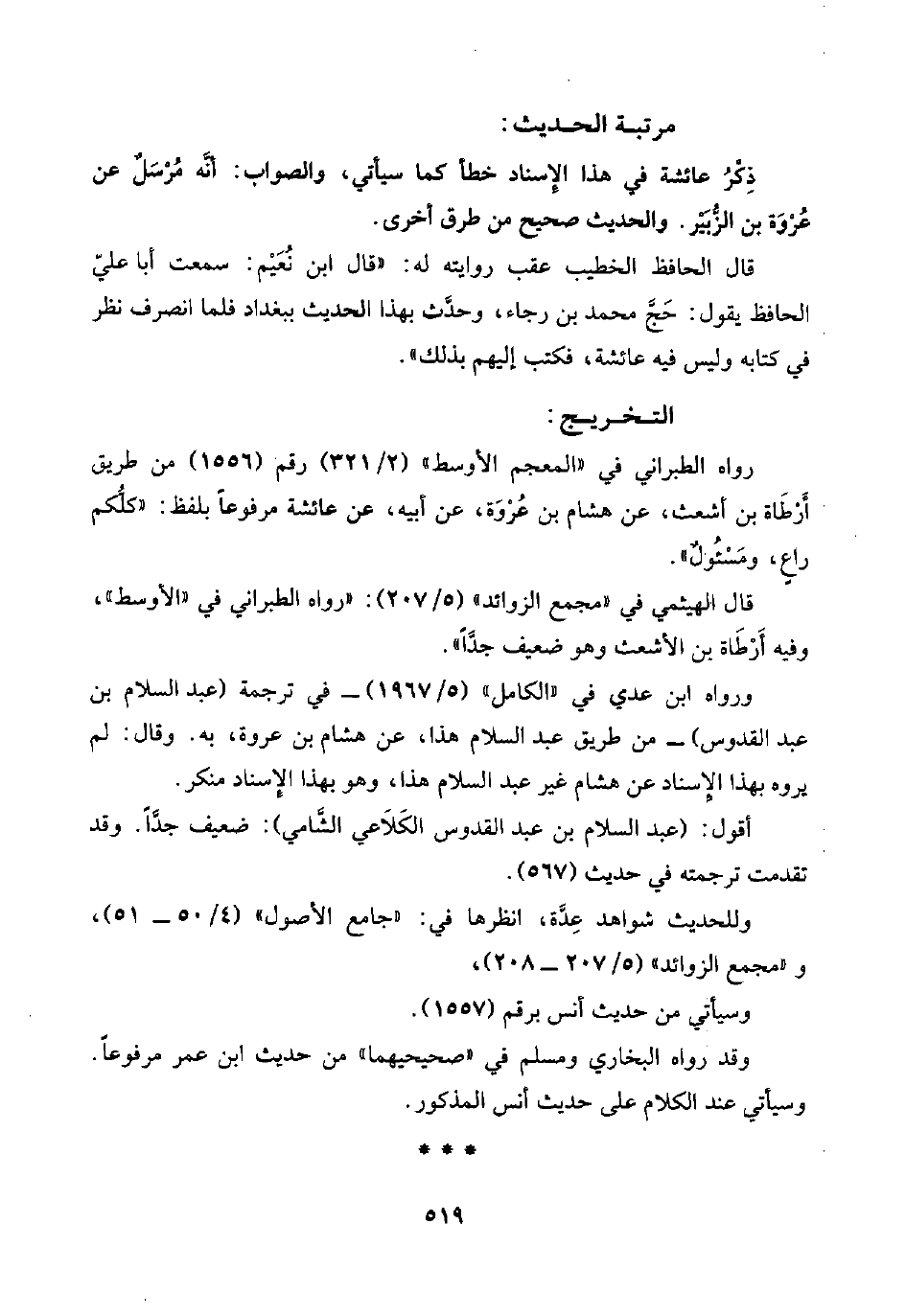 رواه الطبراني في "المعجم الأوسط" (٢/ ٣٢١) رقم (١٥٥٦) من طريق أَرْطَاة بن اشعث، عن هشام بن عُرْوَة، عن أبيه، عن عائشة مرفوعًا بلفظ: "كلُّكم راعٍ، ومَسْئُولٌ".