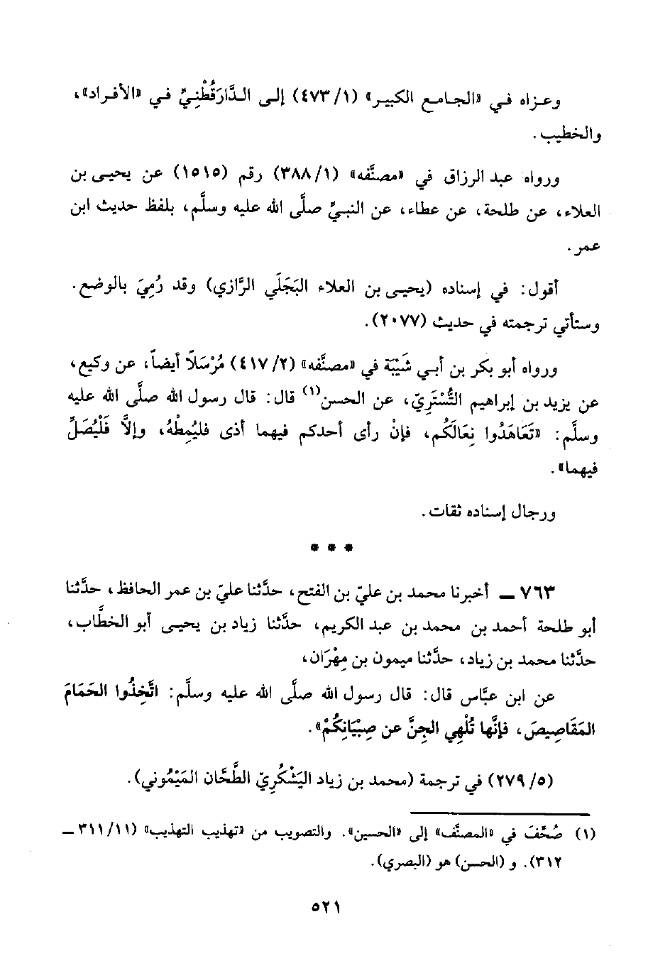 ورواه عبد الرزاق في "مصنَّفه" (١/ ٣٨٨) رقم (١٥١٥) عن يحيى بن العلاء، عن طلحة، عن عطاء، عن النبيِّ صلَّى اللَّه عليه وسلَّم، بلفظ حديث ابن عمر.