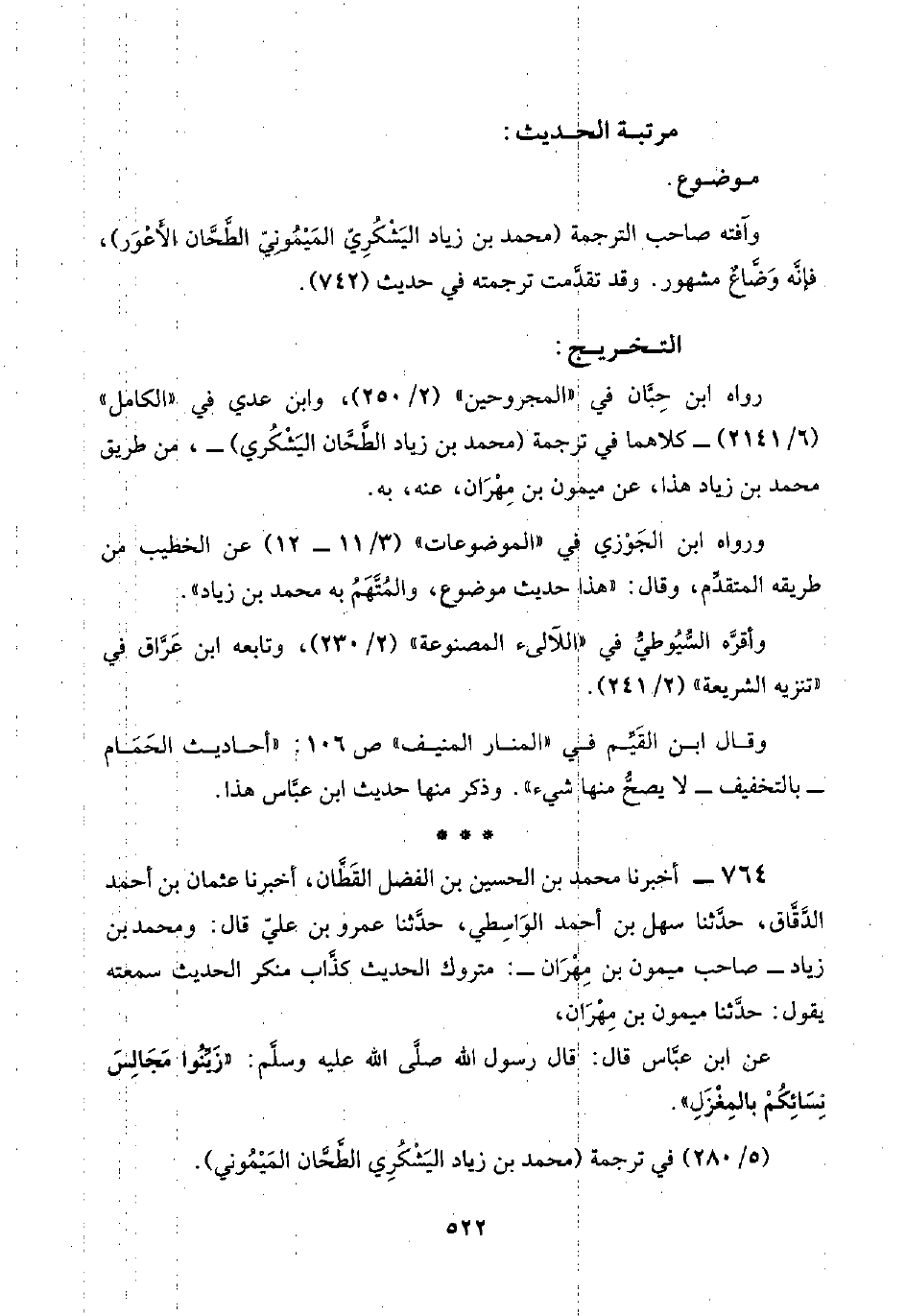 ٧٦٤ - أخبرنا محمد بن الحسين بن الفضل القَطَّان، أخبرنا عثمان بن أحمد الدَّقَّاق، حدَّثنا سهل بن أحمد الوَاسِطي، حدَّثنا عمرو بن عليّ قال: ومحمد بن زياد -صاحب ميمون بن مِهْرَان-: متروك الحديث كذَّاب منكر الحديث سمعته يقول: حدَّثنا ميمون بن مِهْرَان،