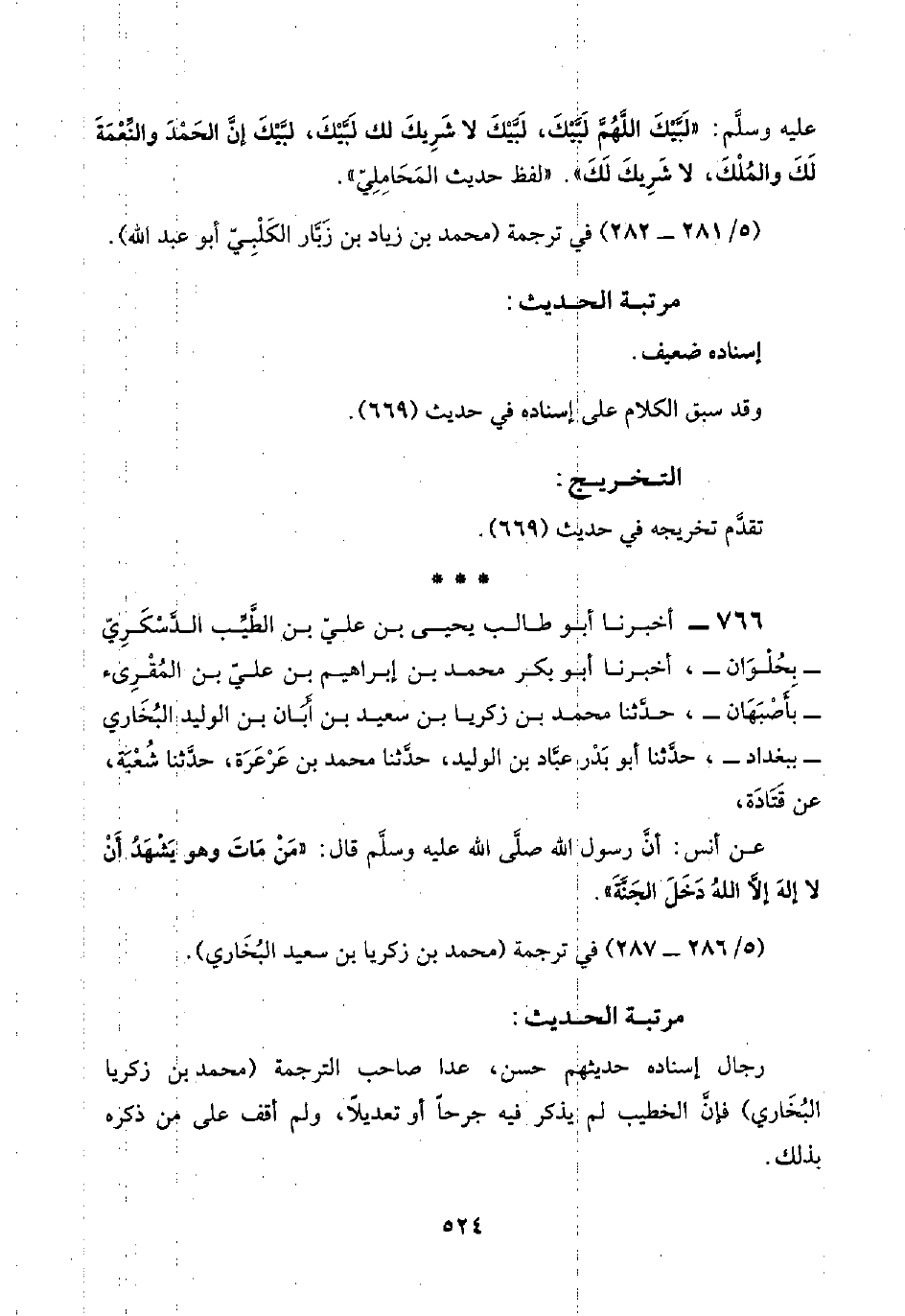 ٧٦٦ - أخبرنا أبو طالب يحيى بن عليّ بن الطَّيِّب الدَّسْكَرِيّ -بِحُلْوَان-، أخبرنا أبو بكر محمد بن إبراهيم بن عليّ بن المُقْرِئ -بأَصْبَهَانَ-، حدَّثنا محمد بن زكريا بن سعيد بن أَبَان بن الوليد البخاري -ببغداد-، حدَّثنا أبو بَدْر عبَّاد بن الوليد، حدَّثنا محمد بن عَرْعَرَة، حدَّثنا شُعْبَة، عن قَتَادَة،