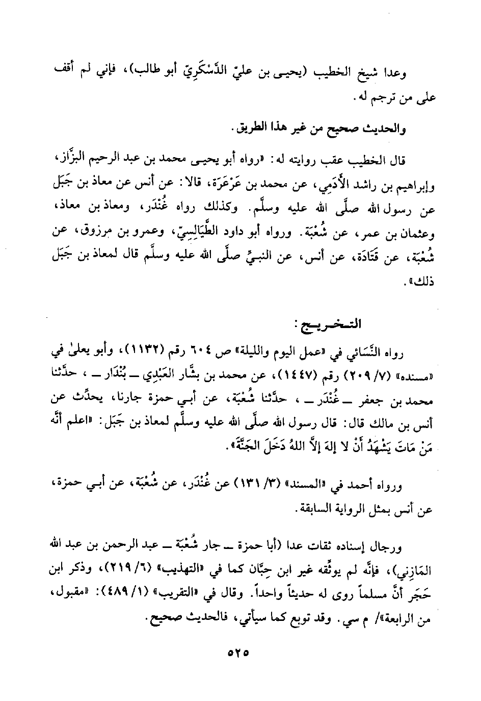قال الخطيب عقب روايته له: "رواه أبو يحيى محمد بن عبد الرحيم البزَّاز، وإبراهيم بن راشد الأَدَمِي، عن محمد بن عَرْعَرَة، قالا: عن أنس عن معاذ بن جَبَل عن رسول اللَّه صلَّى اللَّه عليه وسلَّم. وكذلك رواه غُنْدَر، ومعاذ بن معاذ، وعثمان بن عمر، عن شُعْبَة. ورواه أبو داود الطَّيَالِسِيّ، وعمرو بن مرزوق، عن شُعْبَة، عن قَتَادة، عن أنس، عن النبيِّ صلَّى اللَّه عليه وسلَّم قال لمعاذ بن جَبَل ذلك".
