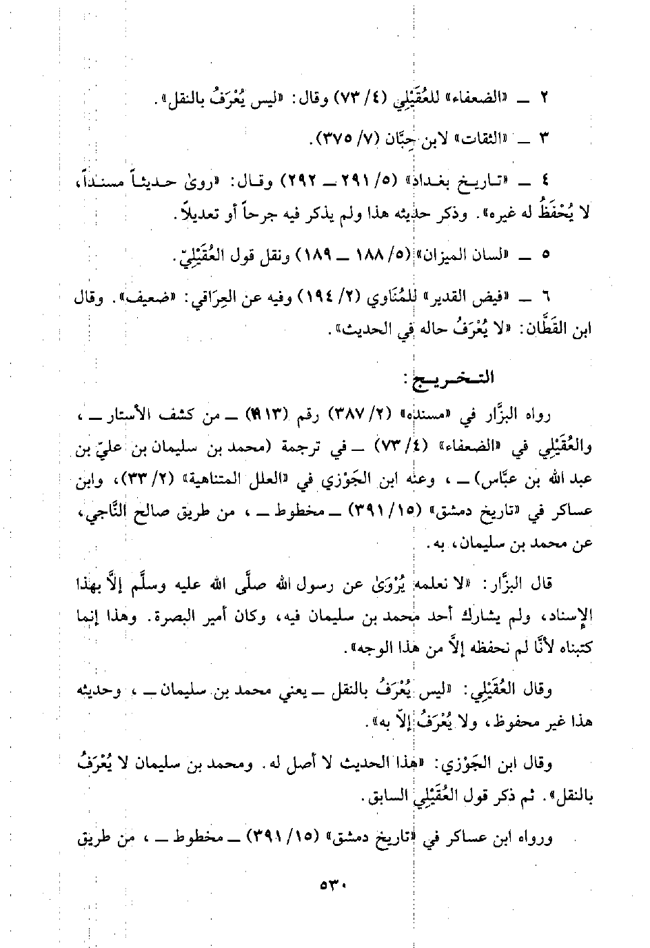 وقال العُقَيْلِي: "ليس يُعْرَفُ بالنقل -يعني محمد بن سليمان-، وحديثه هذا غير محفوظ، ولا يُعْرَفُ إلّا به".