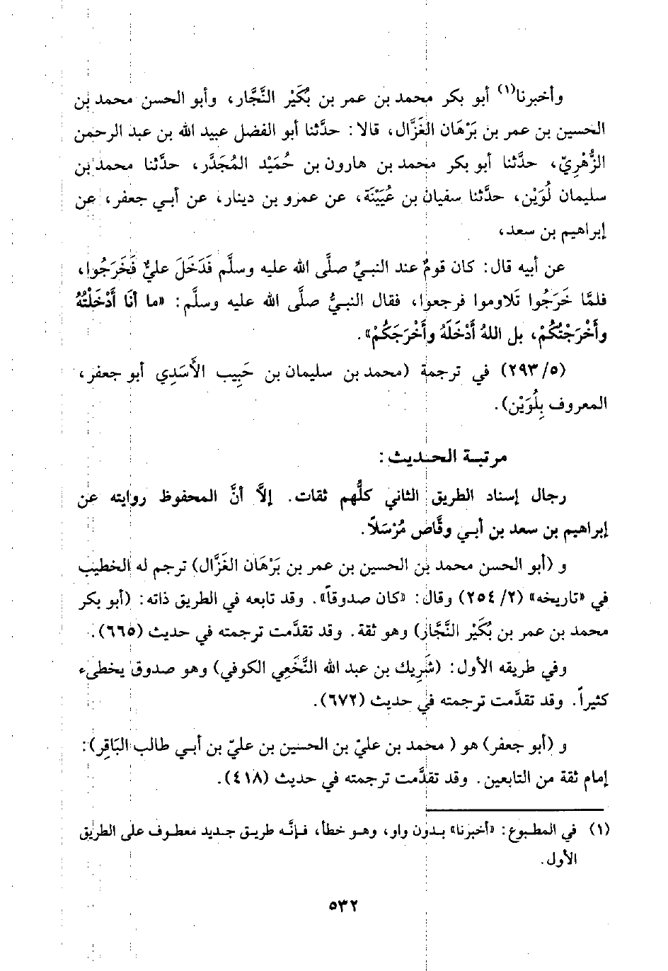 وأخبرنا (¬١) أبو بكر محمد بن عمر بن بُكَيْر النَّجَّار، وأبو الحسن محمد بن الحسين بن عمر بن بَرْهَان الغَزَّال، قالا: حدَّثنا أبو الفضل عبيد اللَّه بن عبد الرحمن الزُّهْرِيّ، حدَّثنا أبو بكر محمد بن هارون بن حُمَيْد المُجَدَّر، حدَّثنا محمد بن سليمان لُوَيْن، حدَّثنا سفيان بن عُيَيْنَة، عن عمرو بن دينار، عن أبي جعفر، عن إبراهيم بن سعد،